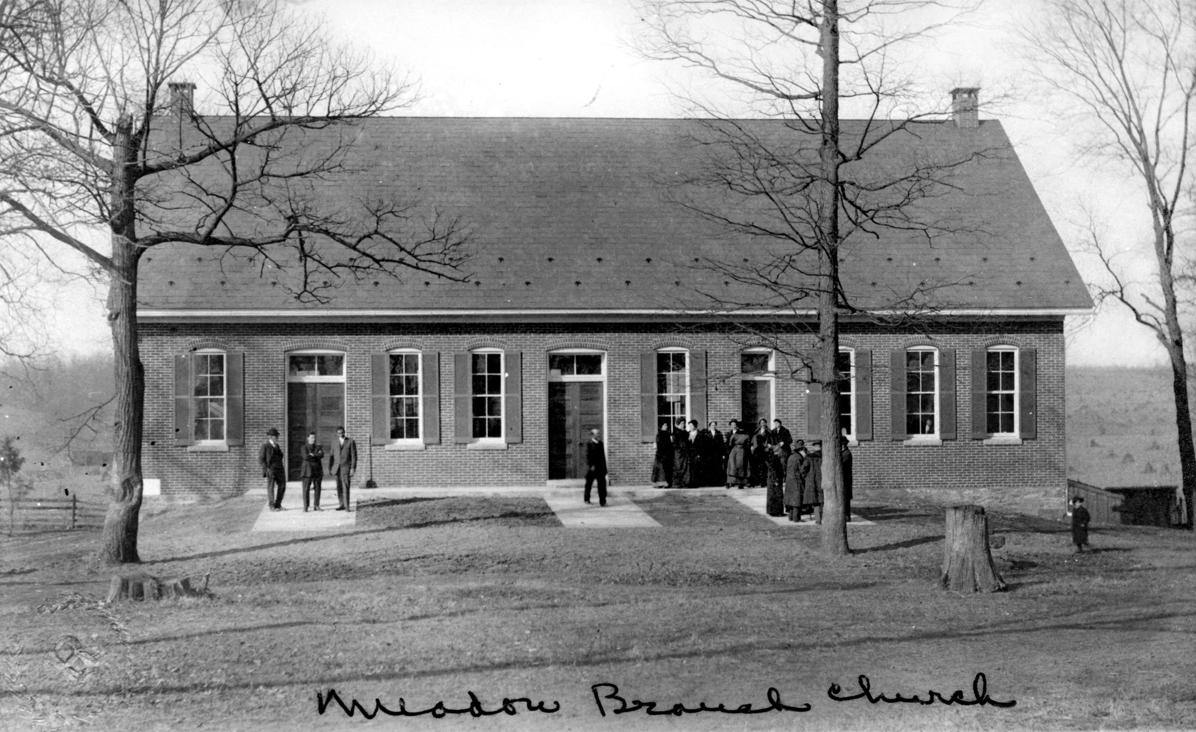 Postcard. B/W silver gelatin print, 3.5" x 5.5". Shows the exterior of the Meadow Branch Church of the Brethren. Embossed seal in lower proper right corner of an "R" at center of a laurel wreath. "Meadow Branch Church" handwritten on front and back.Acquisition
