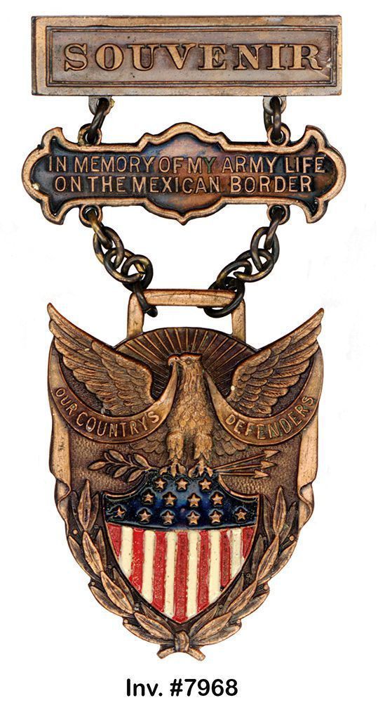 Medal, commemorative. Rectangular bar marked "SOUVENIR." Suspended from this by two small chains is bar marked "IN MEMORY OF MY ARMY LIFE ON THE MEXICAN BORDER." Suspended from this by two small chains is shield-shaped bronze medallion embosed with an eagle with spread wings standing on a shield enameled with red and white stripes and a blue field with white stars; reads "OUR COUNTRY'S DEFENDERS." Reverse of medallion engraved "RAID COLUMBUS, N.M. MARCH 9 GLENN SPRINGS, TEX, MAY 6 SAN YGNACIO, TEX, JUNE 14 NATIONAL GUARD CALLED TO THE COLORS JUNE 18 AMBUSH AT CARRAZAL, MEX. DEATH OF CAPT. BOYD JUNE 21. Maker's mark reads "H.H. STRATTON, CHATTANOOGA, TENN." 3.25"h x 2.625"w.General Notes
