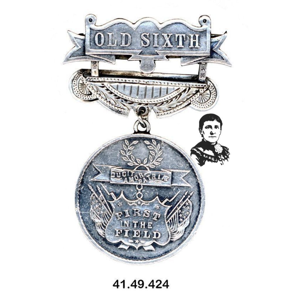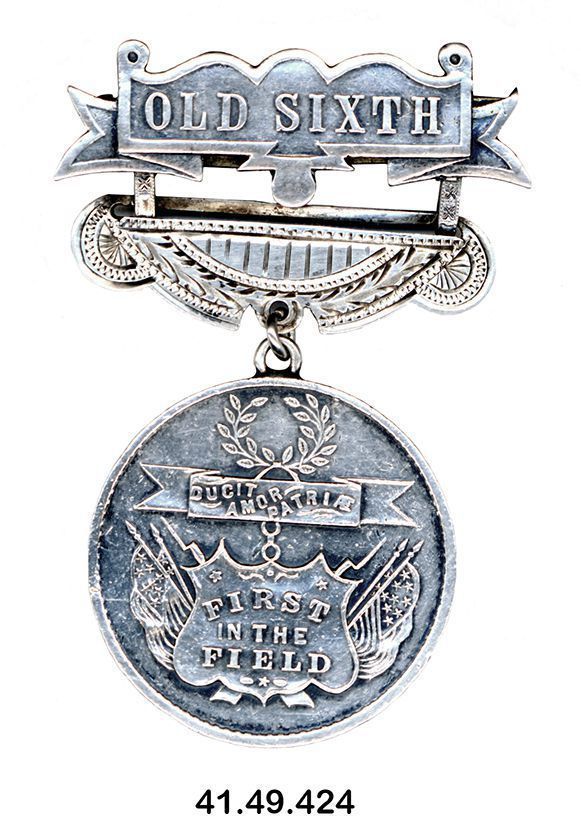 Medal, fraternal. Commemorating the 6th Massachusetts Regiment. Sterling silver. Metal "ribbon" across top reads "OLD SIXTH". Below this is a bar in the shape of a swag decorated with vines. Hanging from this is a round medallion decorated with embossed laurel wreath and shield flanked by flags; shield reads "FIRST IN THE FIELD." Reverse of medallion reads "BALTIMORE 19TH OF APRIL 1861" and is engraved at center "Mary Bostwic Shellman" in script. 2.375" x 3.625"Context