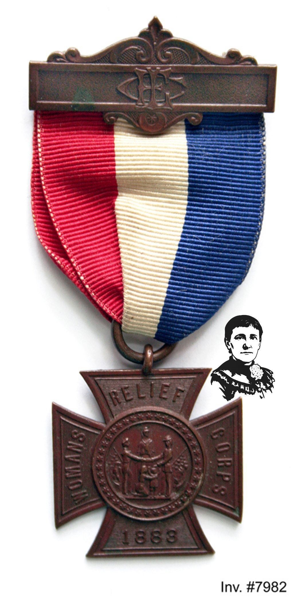 Medal, fraternal. Women's Relief Corps. Bronze Maltese cross decorated with the symbol of the Grand Army of the Republic; arms of the cross marked "WOMENS RELIEF CORPS 1883." Cross suspended from grosgrain ribbon with red, white and blue vertical stripes. Ribbon attached to bar with pin on back. Maker's mark on reverse reads "PATENTED MAY 4 AND SEPT 28, 1886." This medal belonged to Mary Bostwick Shellman, a lifelong supporter of Union Veterans.Context