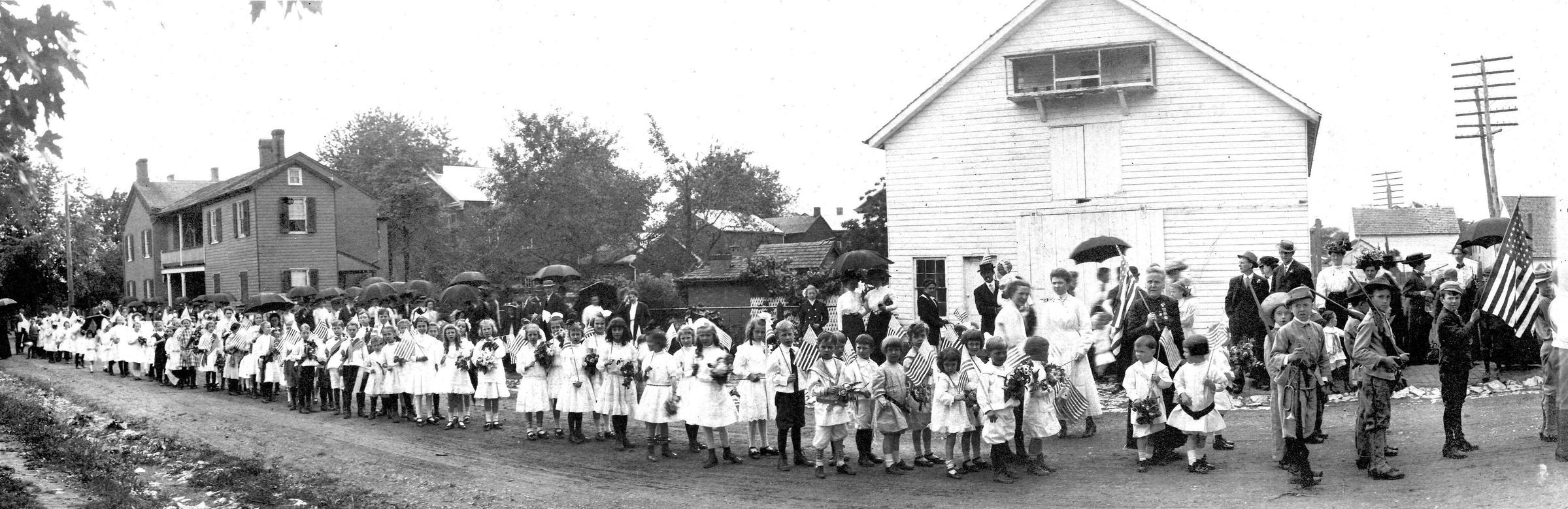 Print, photographic. Memorial Day Parade, Westminster, c.1910. B/W photograph showing a very long line of of children, mostly dressed in white and holding American flags, and standing in a dirt road. Image taken on Church Street, between the cemetery gates and East Main Street. At the head of the line are scouts, a boy holding an American flag, boys shouldering rifles, and then the other children in white. There are adults lining the opposite side of the road, holding dark umbrellas. There is a white barn in the near background and a house on the opposite side of the road down the way. On back in black ink "Harvey D. Shipley leading a parade - Memorial day. About 1910 - 1st Boy Scout troupe. Harvey D. Shipley - donor." in pencil "Bob Dinst, John Bohn, Vernon Baker, Ralph Hunter, Lawrence Fink". 4" x 10.75"