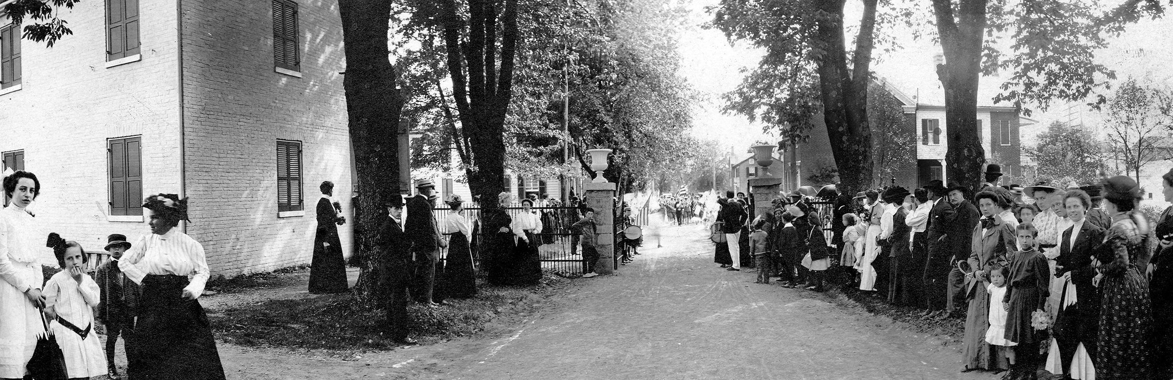 Print, photographic. B/W panoramic photograph of the Westminster Memorial Day parade. Written on back: Memorial Day parade and exercises Westminster Cemetery Bands/Westminster Main Street parade." c.1910Acquisition