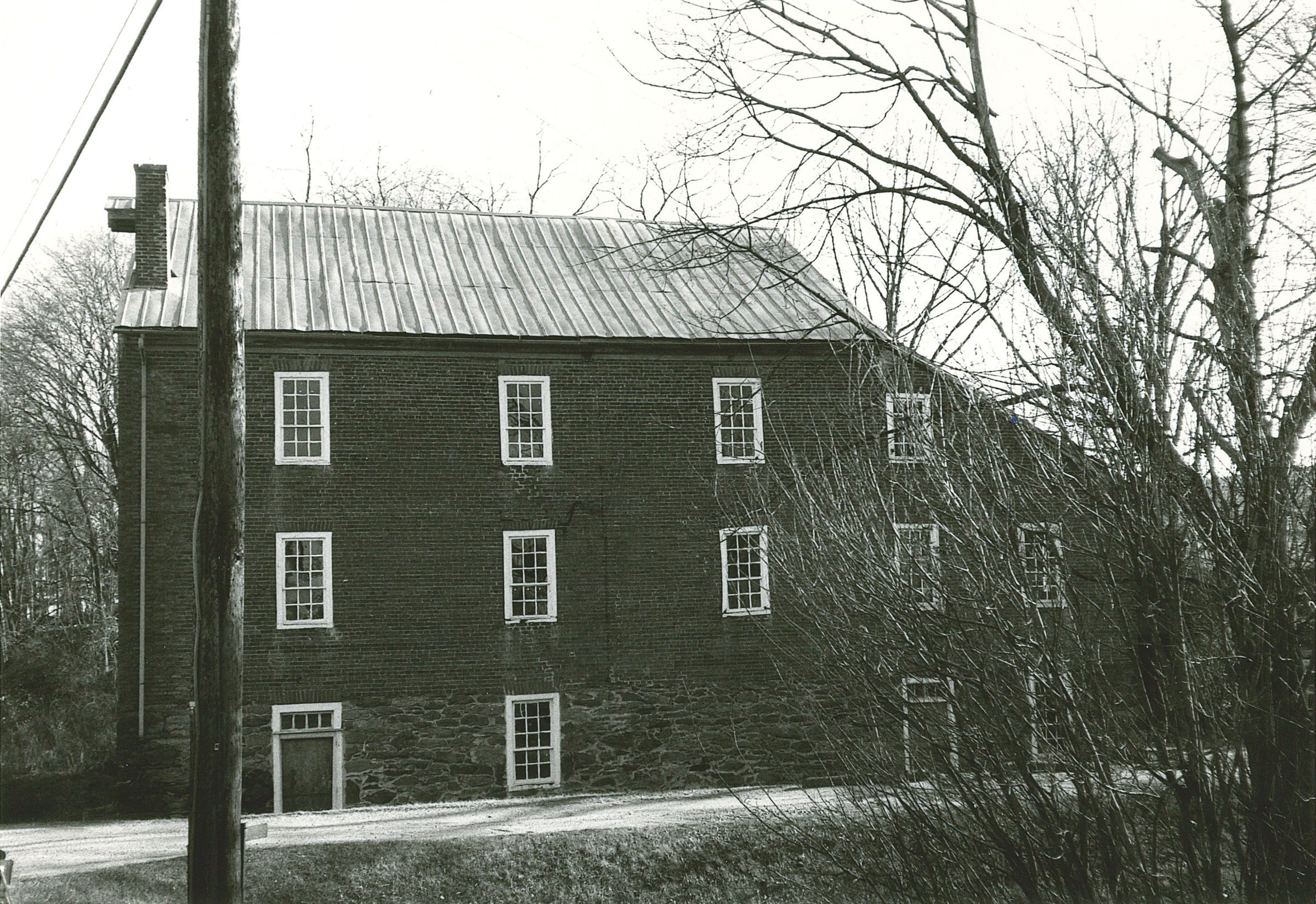 Print, photographic. B/W of the right side of a brick, three story mill. The first floor is stone and has a door in the right corner, a window in the middle another door further down and a window in the corner. The second floor has five windows across. The third floor has four windows across. The roof appears to be tin and there is a chimney near the front right corner. The back side of the mill slopes down and appears to be an addition to the original mill structure. A tree in the right hand corner of the picture obscures some of the right side of the mill. There is a telephone pole in the left foreground. Photo: 5" x 7"