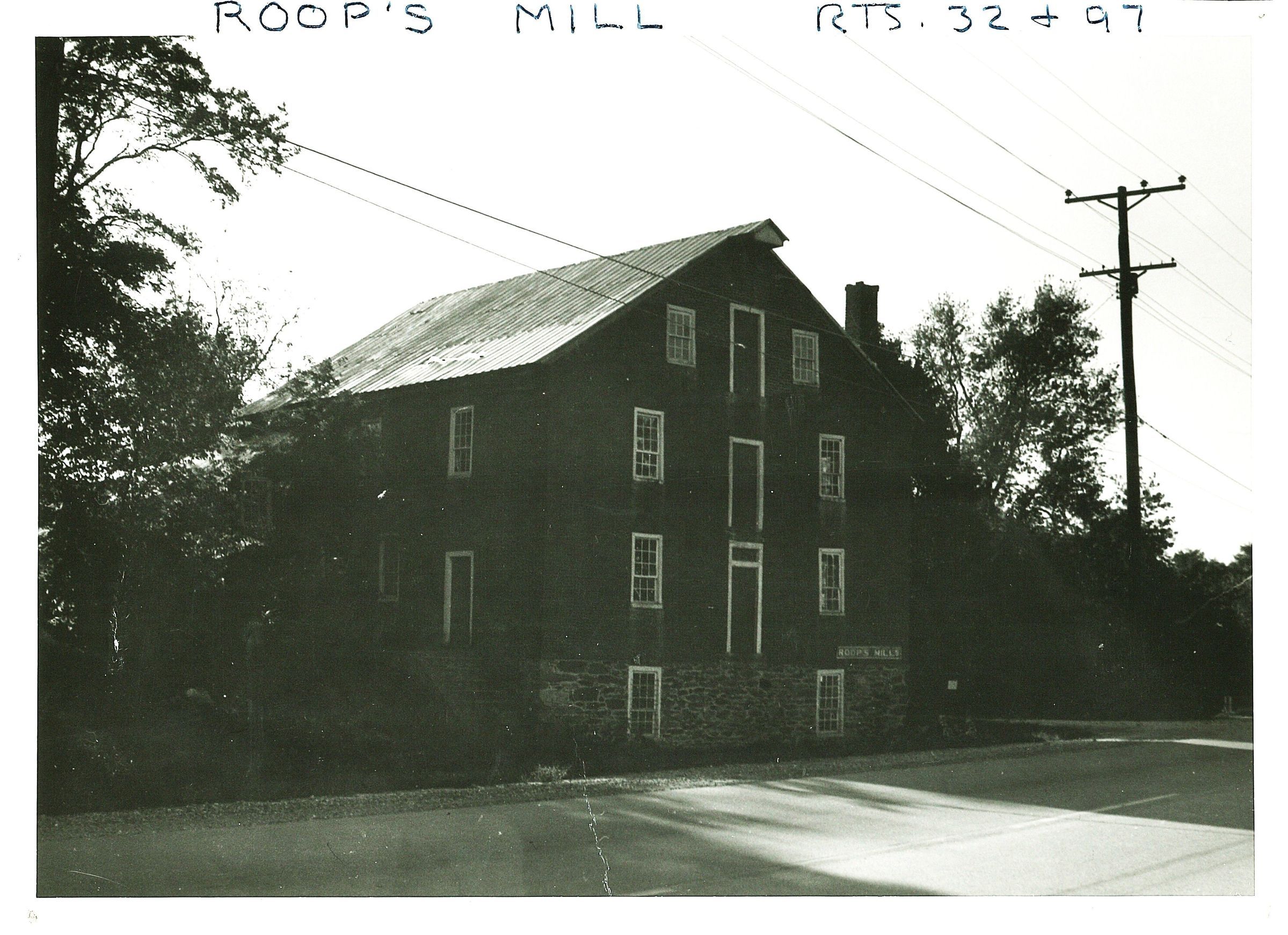 Print, photographic. B/W photo of a brick mill with stone first floor. A highway runs along side the front of the mill. The front of the first story of the mill has two windows and stairs up the left side to the second story. The front of the second story has a door in the middle with windows on either side, the left side has two windows and then a door at the top of the steps from the ground level. The third floor also has a door in the center with windows on either side and two windows on the left side. The fourth floor has a door in the middle with smaller windows on either side. Above the fourth story door is a over hang typical for mills. There is a chimney on the right side of the roof. The back left side of the building has a sloped roof, brick addition built onto it. There is a hole in the upper portion of its side. There is grass growing wildly around the left side of the mill. To the right of the mill there is another road. Photo: 5" x 7"