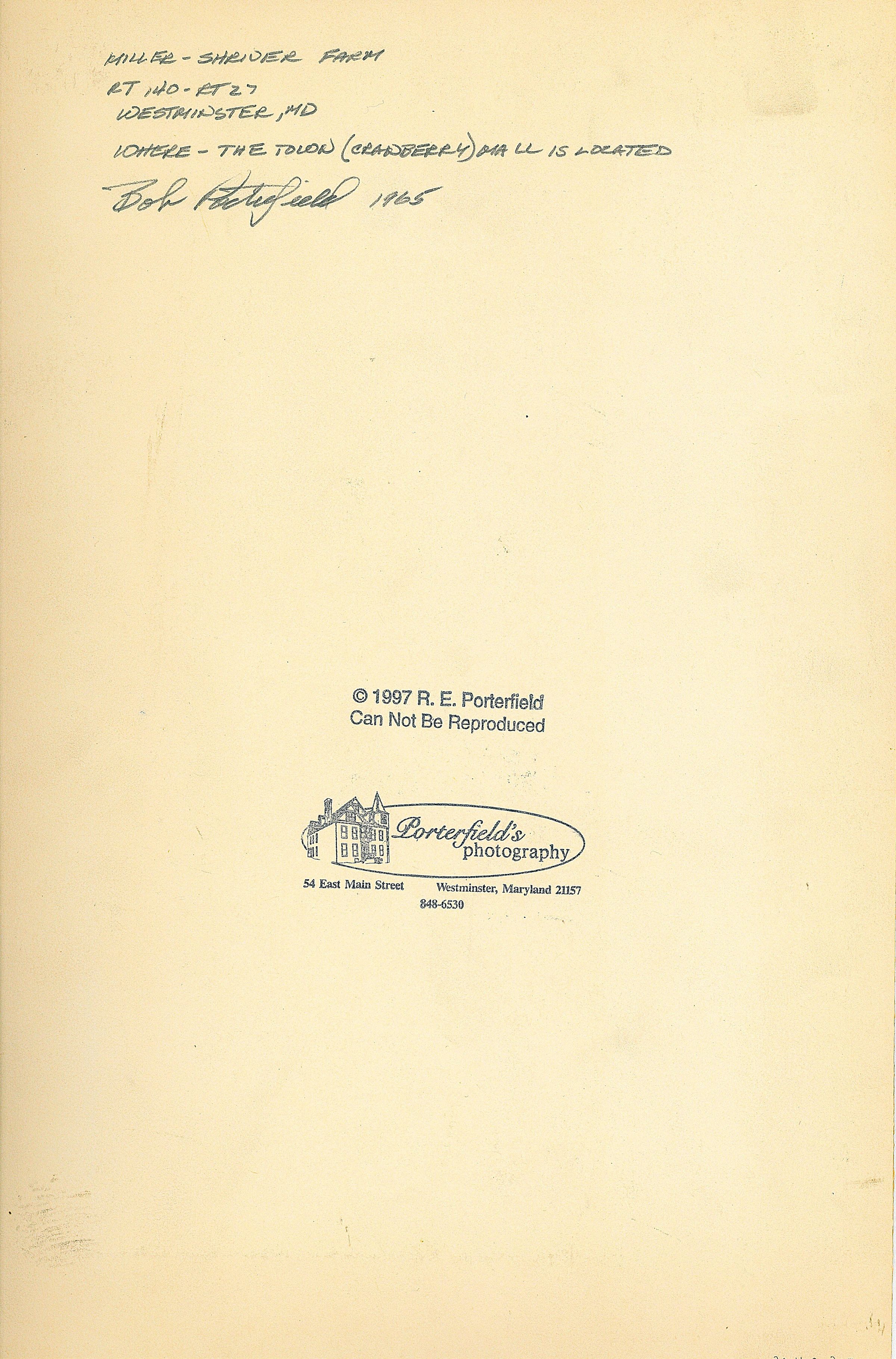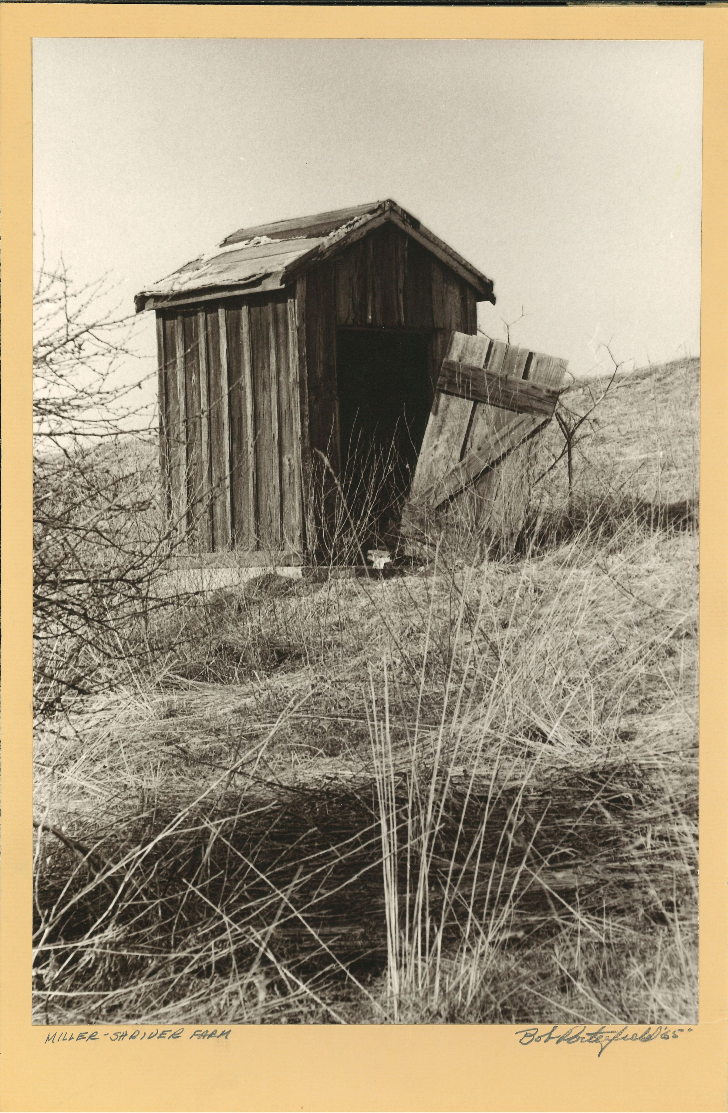 Print, photographic. B/W image taken at the Miller/Shriver farm, 1965. View of a small frame outbuilding, possibly an outhouse. Building is abandoned; door is hanging open on only top hinge; most of roof is missing. Mounted on cream-colored mat board. Written below image: MILLER-SHRIVER FARM BOB PORTERFIELD ’65. Photographer’s stamp on back: © 1997 R.E. Porterfield 54 East Main Street Westminster, Maryland 21157 848-6530. 13” x 8.5”.Acquisition