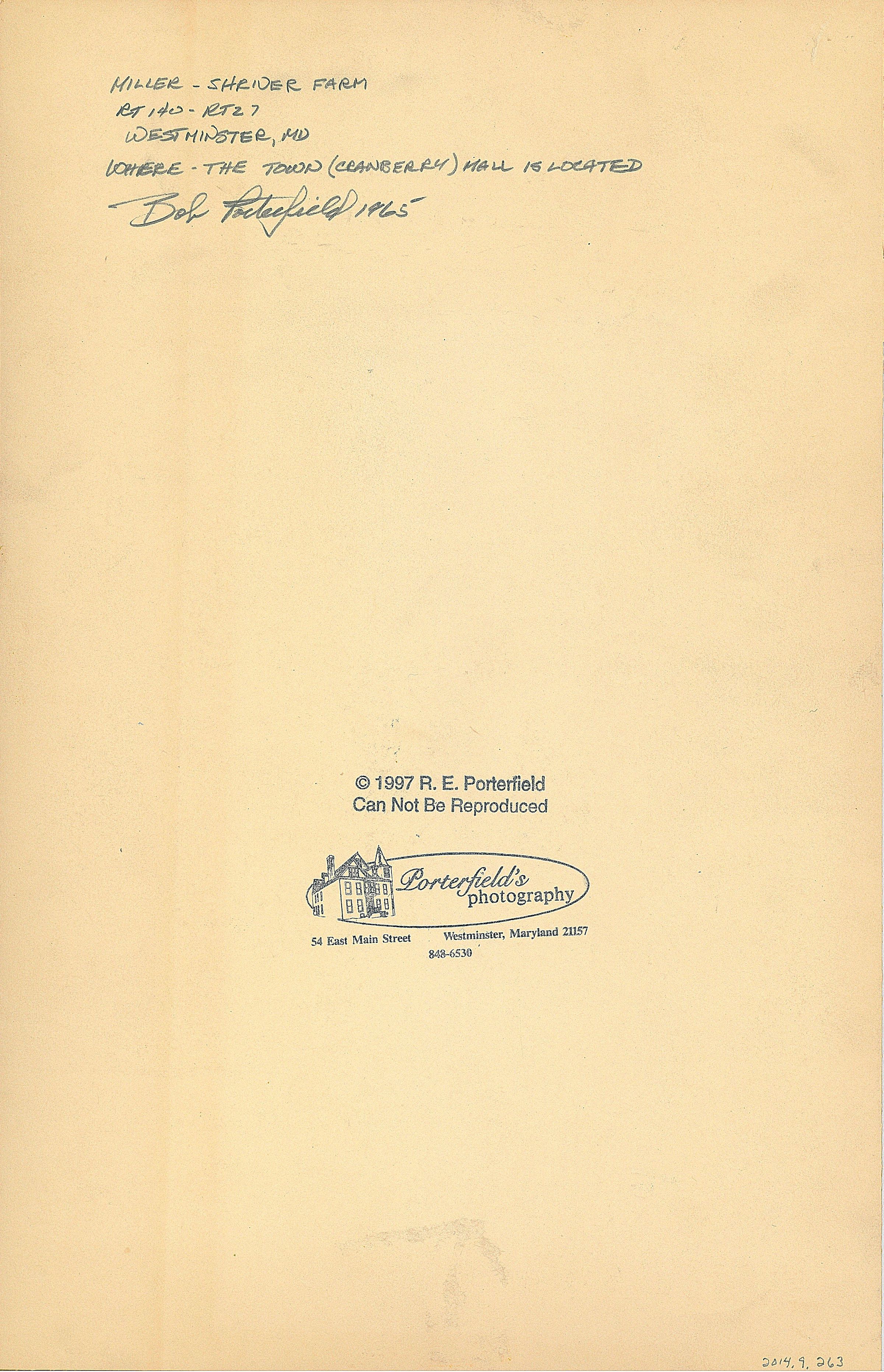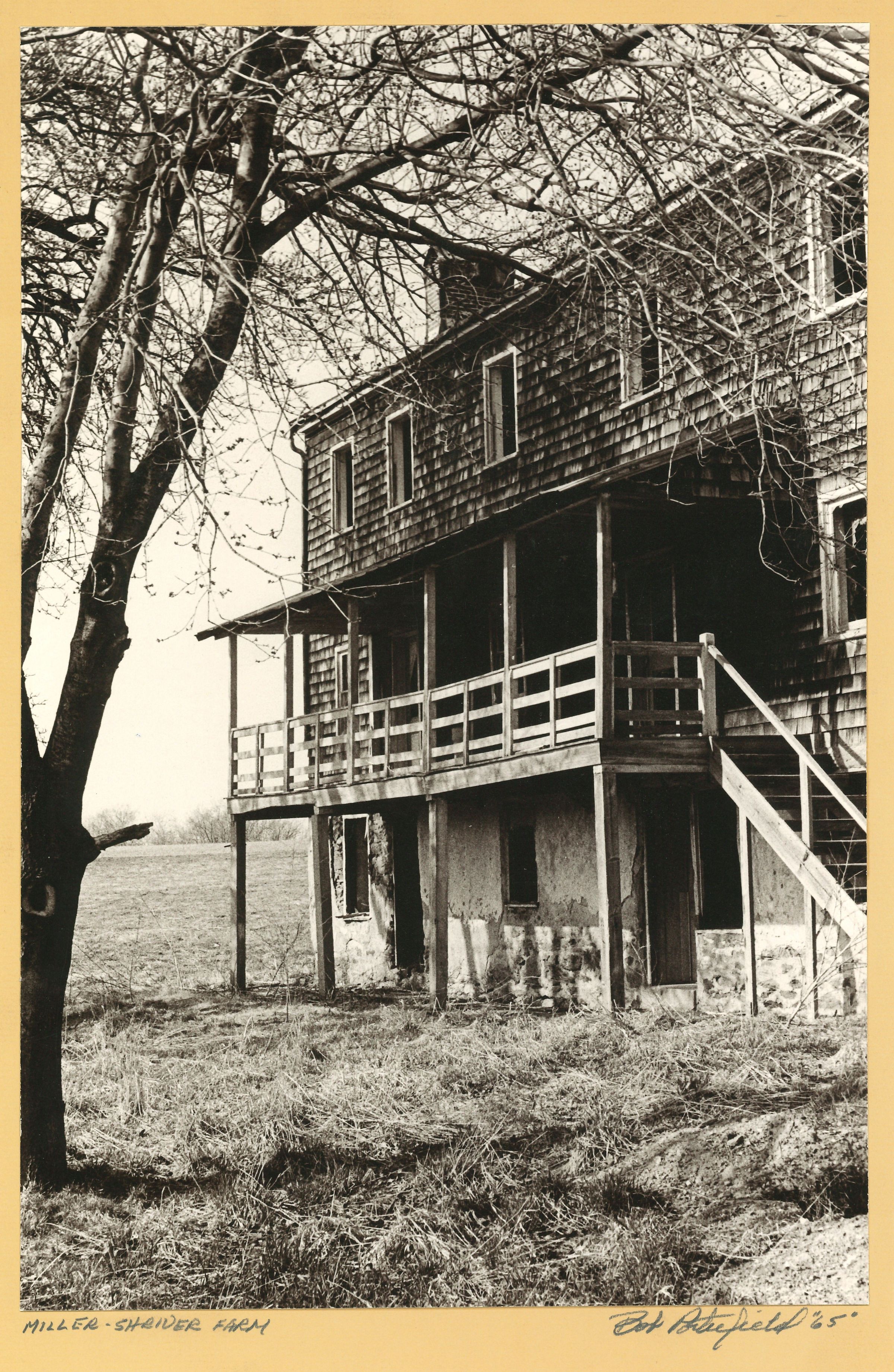 Print, photographic. B/W image taken at the Miller/Shriver farm, 1965. 2-story frame building, shingled, with stone foundation and full walk-in basement. Part of the staircase leading to the first floor is visible. Building is abandoned. Mounted on cream-colored mat board. Written below image: MILLER-SHRIVER FARM BOB PORTERFIELD ’65. Photographer’s stamp on back: © 1997 R.E. Porterfield 54 East Main Street Westminster, Maryland 21157 848-6530. 13” x 8.25”.Acquisition