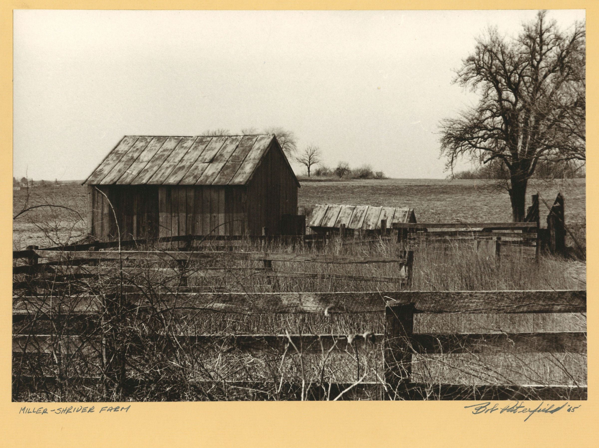 Print, photographic. B/W image taken at the Miller/Shriver farm, 1965. View of two outbuildings. One has vertical board siding (some boards missing) and a metal roof. The lower metal roof of another building is slightly behind the first. Buildings are abandoned. Mounted on cream-colored mat board. Written below image: MILLER-SHRIVER FARM BOB PORTERFIELD ’65. Photographer’s stamp on back: © 1997 R.E. Porterfield 54 East Main Street Westminster, Maryland 21157 848-6530. 9.375” x 12.25”.Acquisition