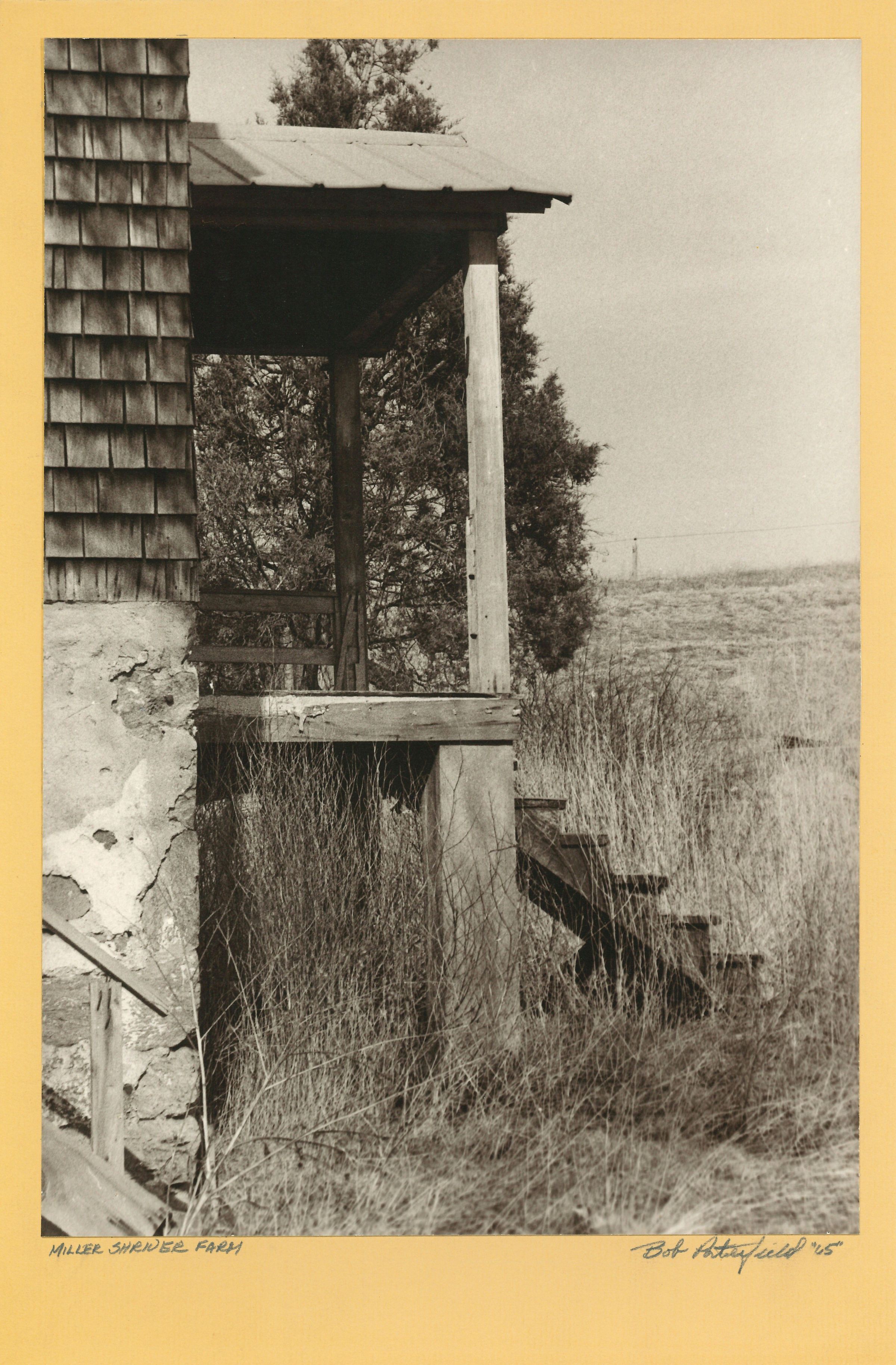 Print, photographic. B/W image taken at the Miller/Shriver farm, 1965. Detail of the staircase leading to the first floor, the corner of the stone foundation and frame building are visible. Building is abandoned. Mounted on cream-colored mat board. Written below image: MILLER-SHRIVER FARM BOB PORTERFIELD ’65. Photographer’s stamp on back: © 1997 R.E. Porterfield 54 East Main Street Westminster, Maryland 21157 848-6530. 13.25” x 8.625”.Acquisition