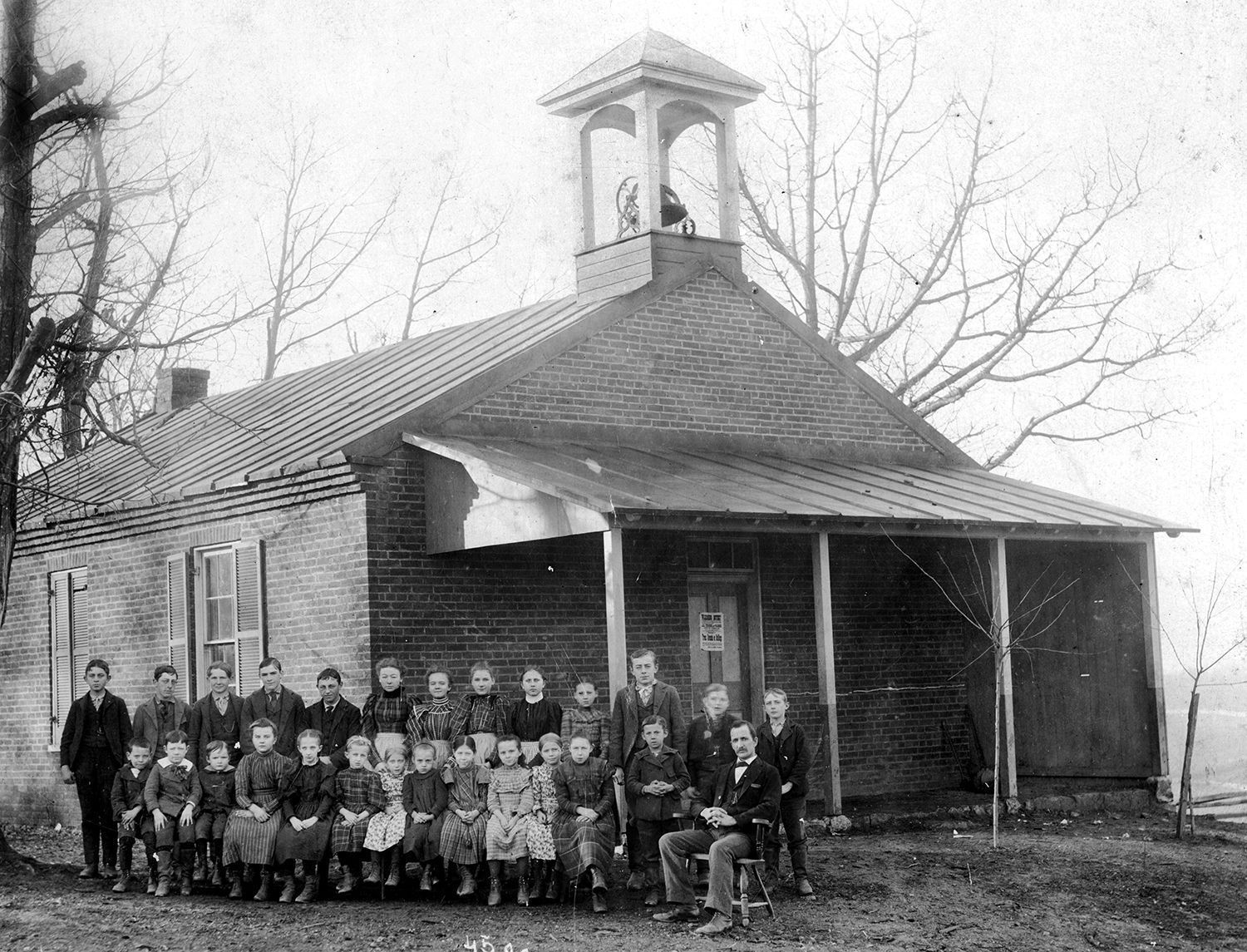 Print, photographic. Morelock's School, one-room school, Uniontown district, Carroll County. Class photo taken in front of brick schoolhouse. Teacher seated in chair. Schoolhouse has cupola with a bell. Mounted on tan board. Written on back: "416 Dr. W.W. Copenhaven - donor, 2727 Netherlands Ave., New York City, NY. Morelock's school, Uniontown dist., Clayton Copenhaven teacher, about 1902." Overall size: 10" x 12". Image size: 7" x 9.25".Acquisition