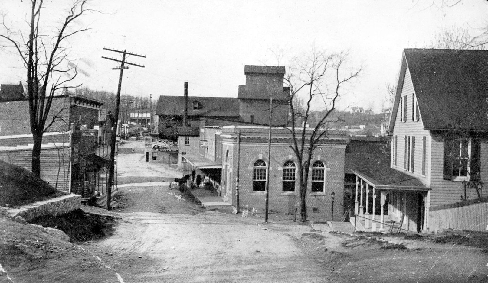 Black and white photograph of Main Street Mount Airy in 1908. The photograph shows 5484 Main St, North of the B&0 railroad, with various store fronts lining the dirt road. The photograph is not mounted or matted and has an overall measurement of 3.5"x 5.5" The image is the front of a postcard.