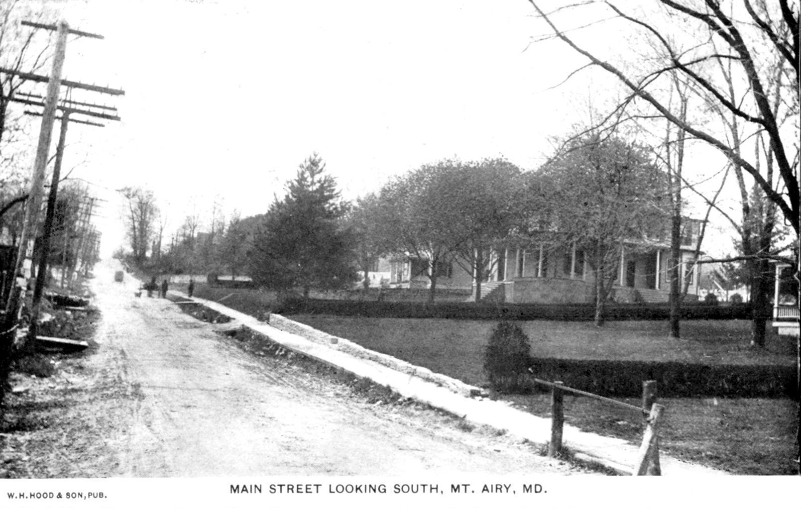 Postcard. B/W photograph of Main Street, Mount Airy, looking south. The street is lined with telephone poles on the proper left side of the photograph, while on the right side are two visible homes. The caption on the front reads, " W.H. Hood and Son, Pub., Main Street looking South, Mt. Airy, MD". A correspondance is in the back address to a Mrs. Snader in Baltimore, MD. A green postage stamp of one cent is on the back. 3.5" x 5.5".Acquisition