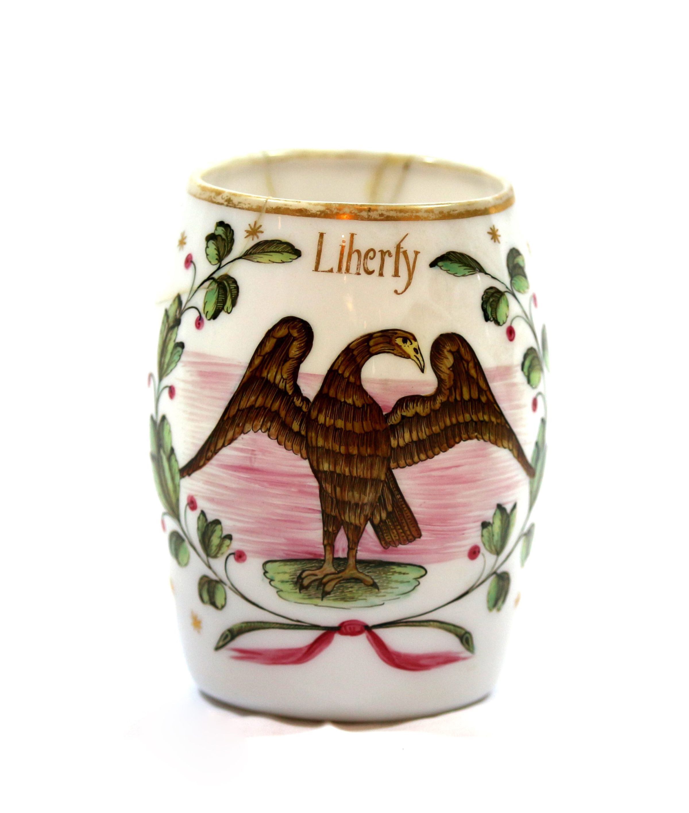 Mug. White handblown glass, C-shaped handle on one side. Handpainted design: "Liberty" at top, eagle in center of laurel wreath with small gold stars. 4.75"h x 4.5'w x 3.5"d.Acquisition