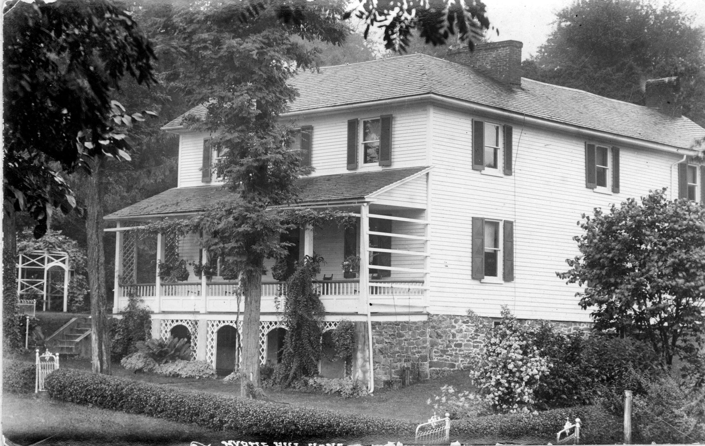 Black and white photograph of Myrtle Hill in Bruceville. The photograph features the house before it was painted red. The photograph shows the front and side facades, with the surrounding gardens. The photograph is not mounted or matted and measures 3.00"x 4.00".