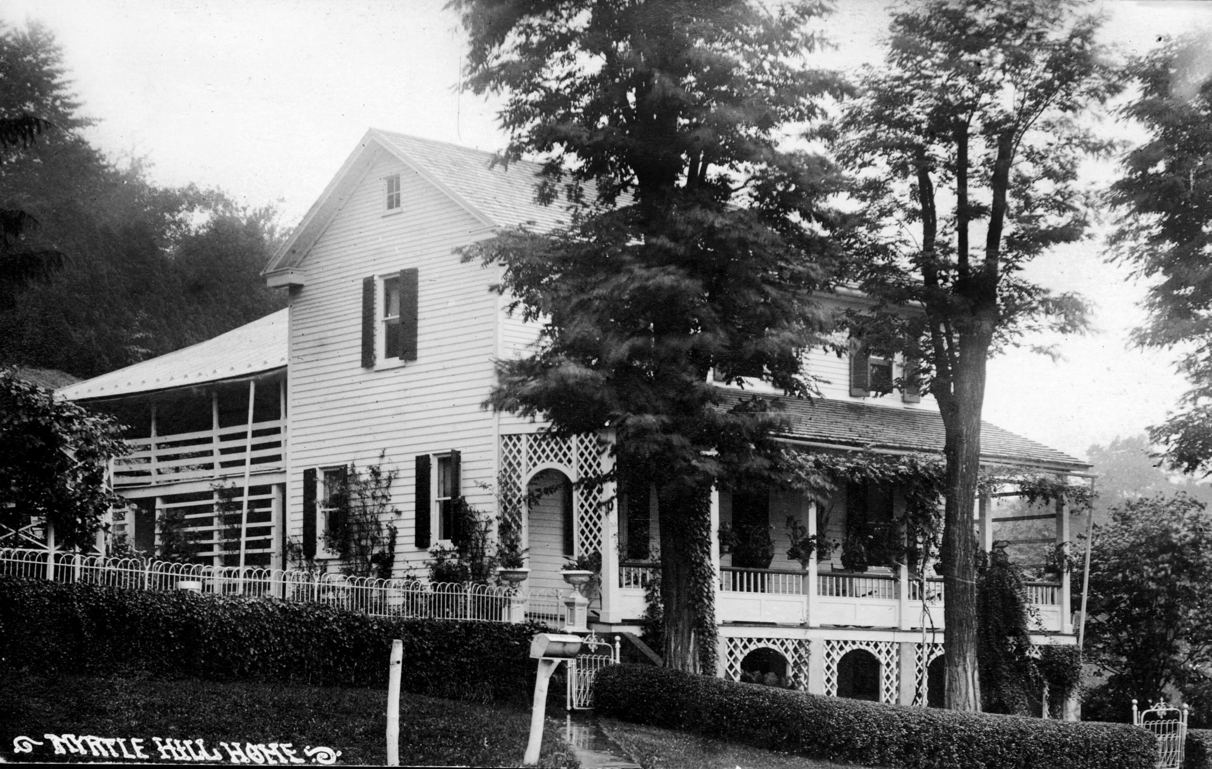 Black and white photograph of Myrtle Hill in Bruceville.The photograph features the side façade of the house with a view of the lattice work of the side of the porch, as well as the two story porch. The photograph is not mounted or matted and measures 3.5"x 5.375". The photograph is intended to be a postcard.