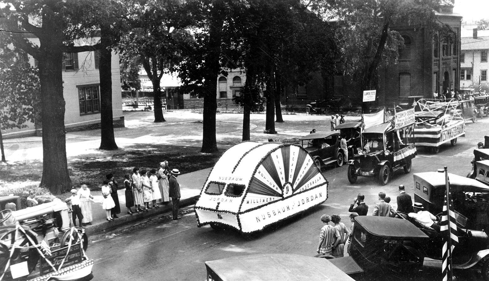 Print, photographic. B/W silver gelatin print, 3.25" x 5.75". Shows the float from Nusbaum and Jordan, a large semi-circular piece which is labeled "Nusbaum and Jordan Millinery Notions Silks Coats Dresses Underwear." Written on back is "July 3, 1925 First prize - $25."Acquisition