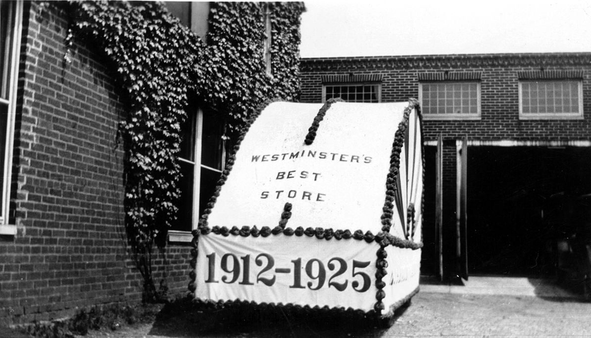 Print, photographic. B/W photo of the Nusbaum & Jordan float in a parade in Westminster. Sign on float reads "Westminster's Best Store 1912-1925."Acquisition