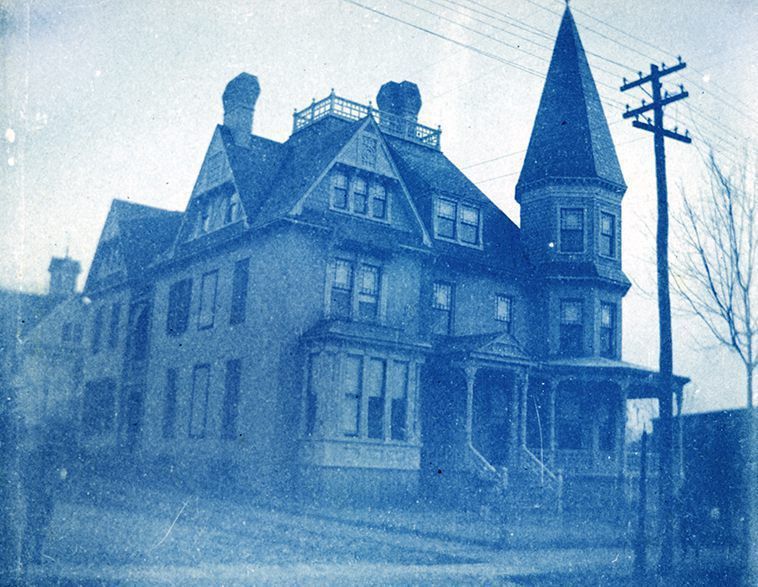 Black and white photograph of Orndorff House on West Main Street in Westminster. The photograph is an iron salt print, giving it a blue tint. The three story house has multiple outcoves and niches as well as a front porch the wraps around the tower like structure seen in the proper right side of the photograph. The photograph is not mounted or matted and measures 3.0"x 4.0".