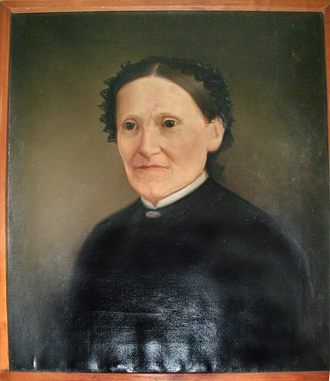 Painting. Portrait, oil on canvas, "Great Grandmother" _______ Grammer, female upper torso, black dress, white collar, pinkish brooch at neck, brown hair, black lace trim bonnet. Canvas measures 22"h x 18"w. 23.25" x 19.25" x 1.125", stained maple frame, not original frame, no marks, Carroll County, c. 1870.