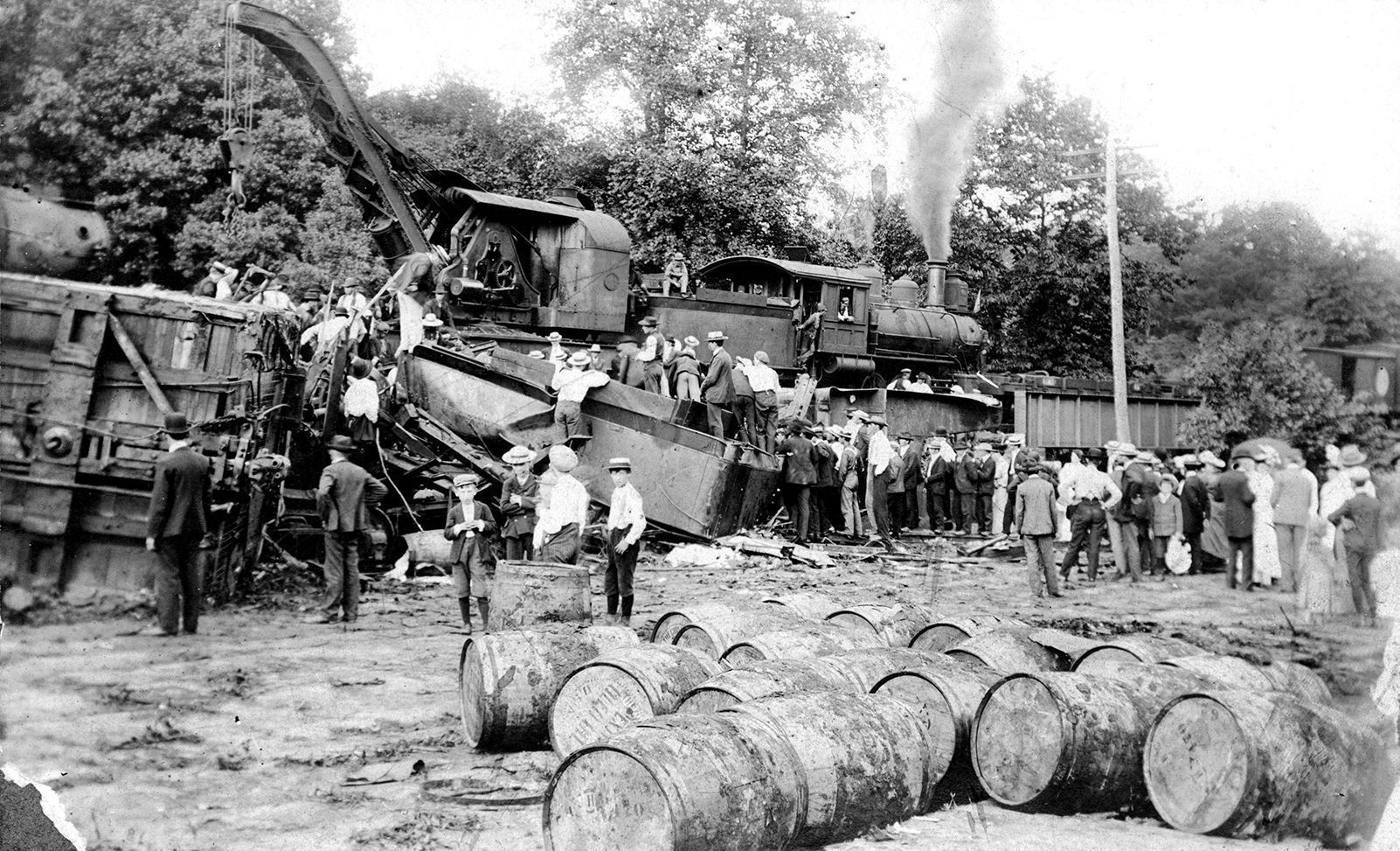 Print, photographic. B/W photo of the railroad accident at Patapsco, Md. Shows damaged railroad cars and men working to remove debris from tracks, spectators are watching from right side, stack of barrels labeled "Oleo Oil" in foreground. Mounted on dark gray board. Impressed "Mitchell’s Art Gallery WESTMINSTER, MD." below image. Overall size 8" x 9.75"; image measures 4.625" x 4.5".Acquisition