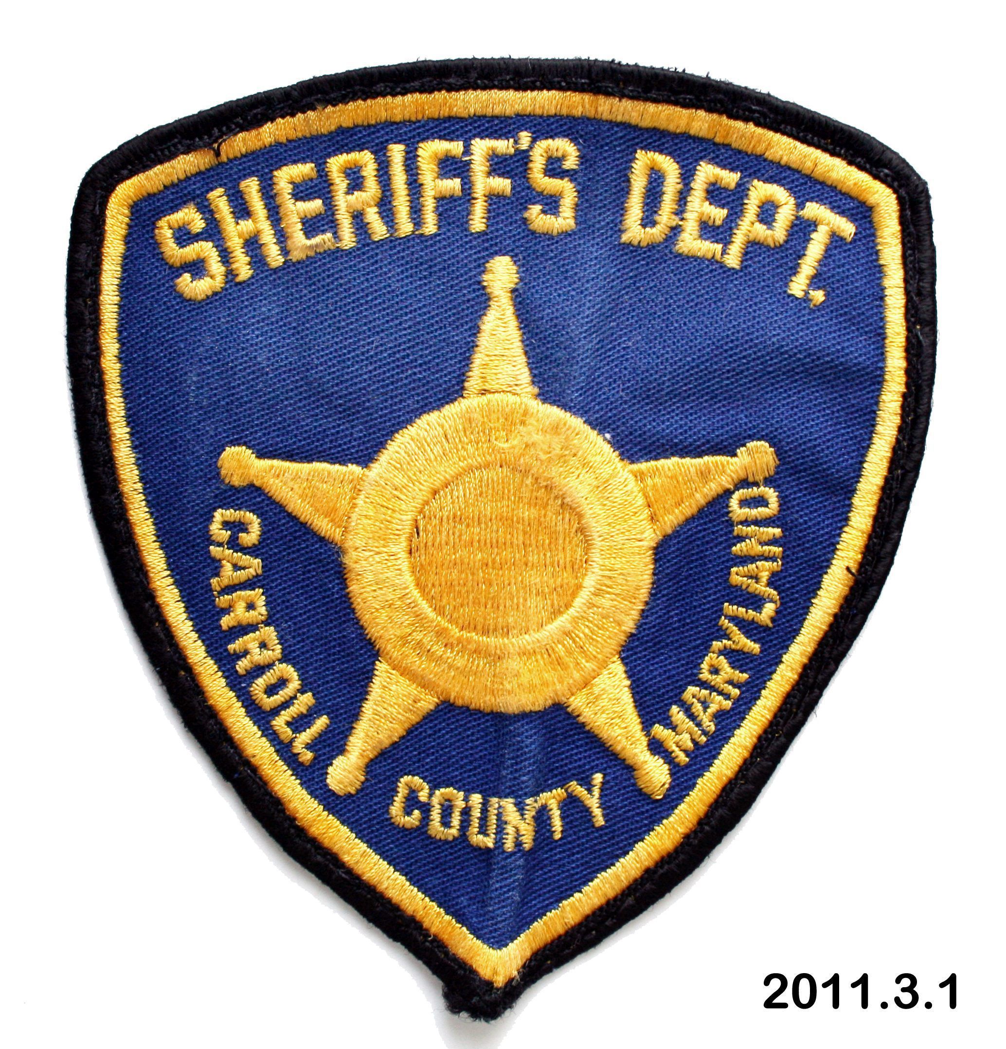 Patch. Shoulder patch for uniform of Carroll County Sheriff's Office, 1970-1992. Cotton; inverted triangle with convex sides; blue background with machine embroidered gold five-pointed star at center and SHERIFF'S DEPT. CARROLL COUNTY MARYLAND; black edge with thin gold band around inside of edge. Thin white fabric backing. 4.375" x 3.875"Acquisition
