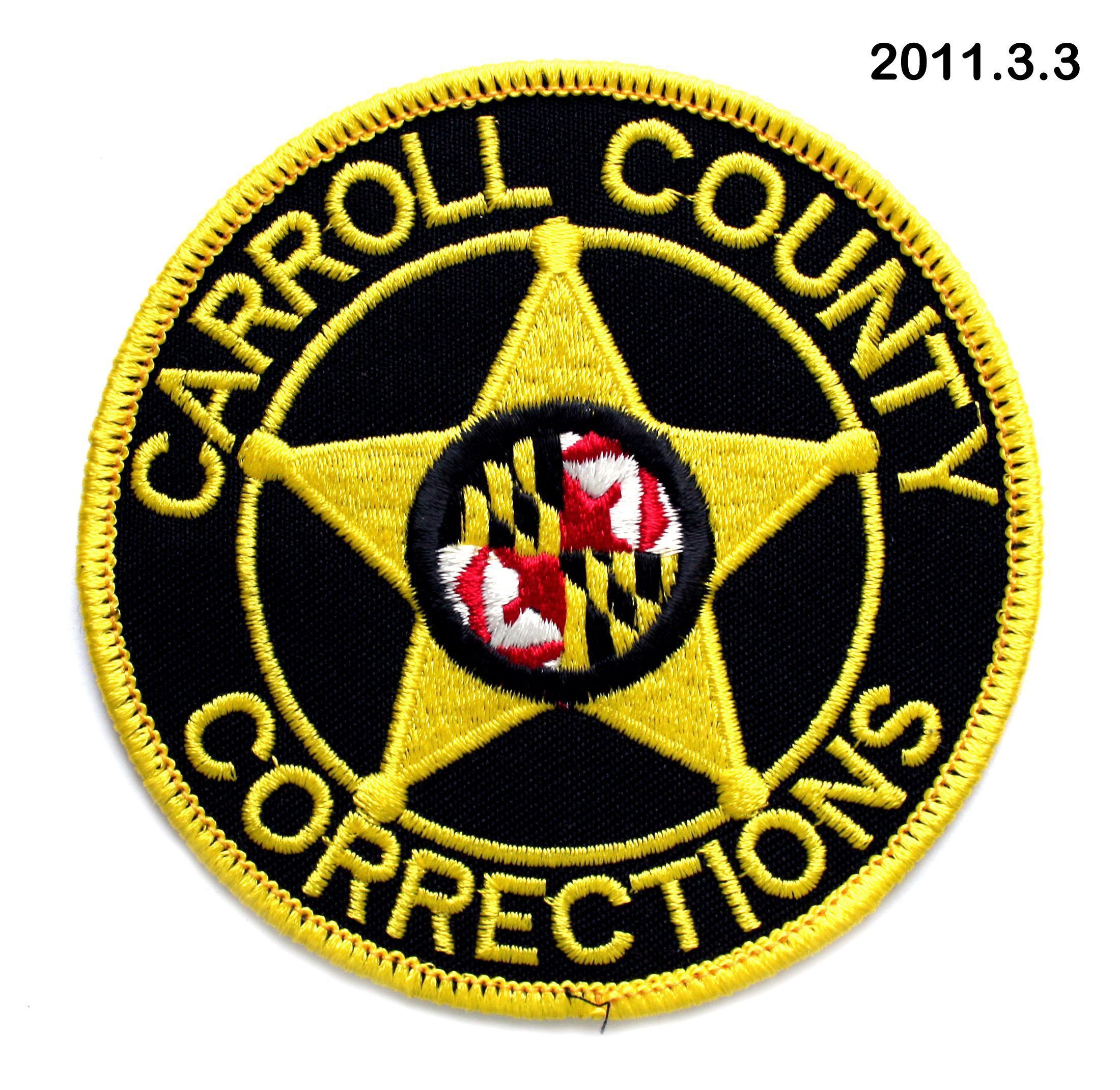 Patch. Shoulder patch for uniform of Carroll County Sheriff's Office, 1995-1999. Cotton; round; black background with machine embroidered gold five-pointed star at center; at center of star is Maryland flag; CARROLL COUNTY CORRECTIONS embroidered in gold around edge; woven gold band around edge. 4" diameter.Acquisition