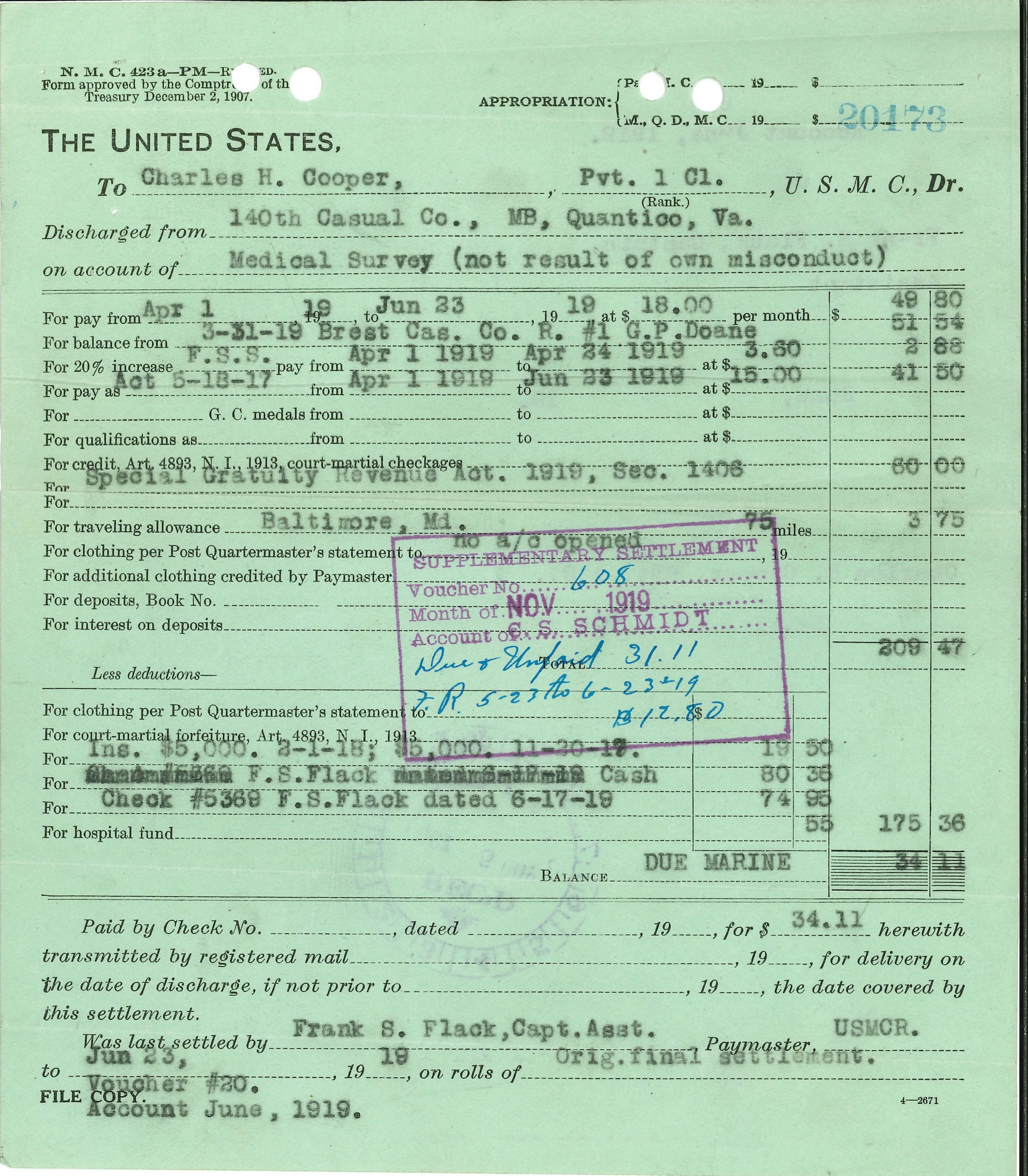 Pay receipt, Pfc Charles H. Cooper, discharged from 140 Casualty Co. MB Quantico, Va. May, 1919.Acquisition