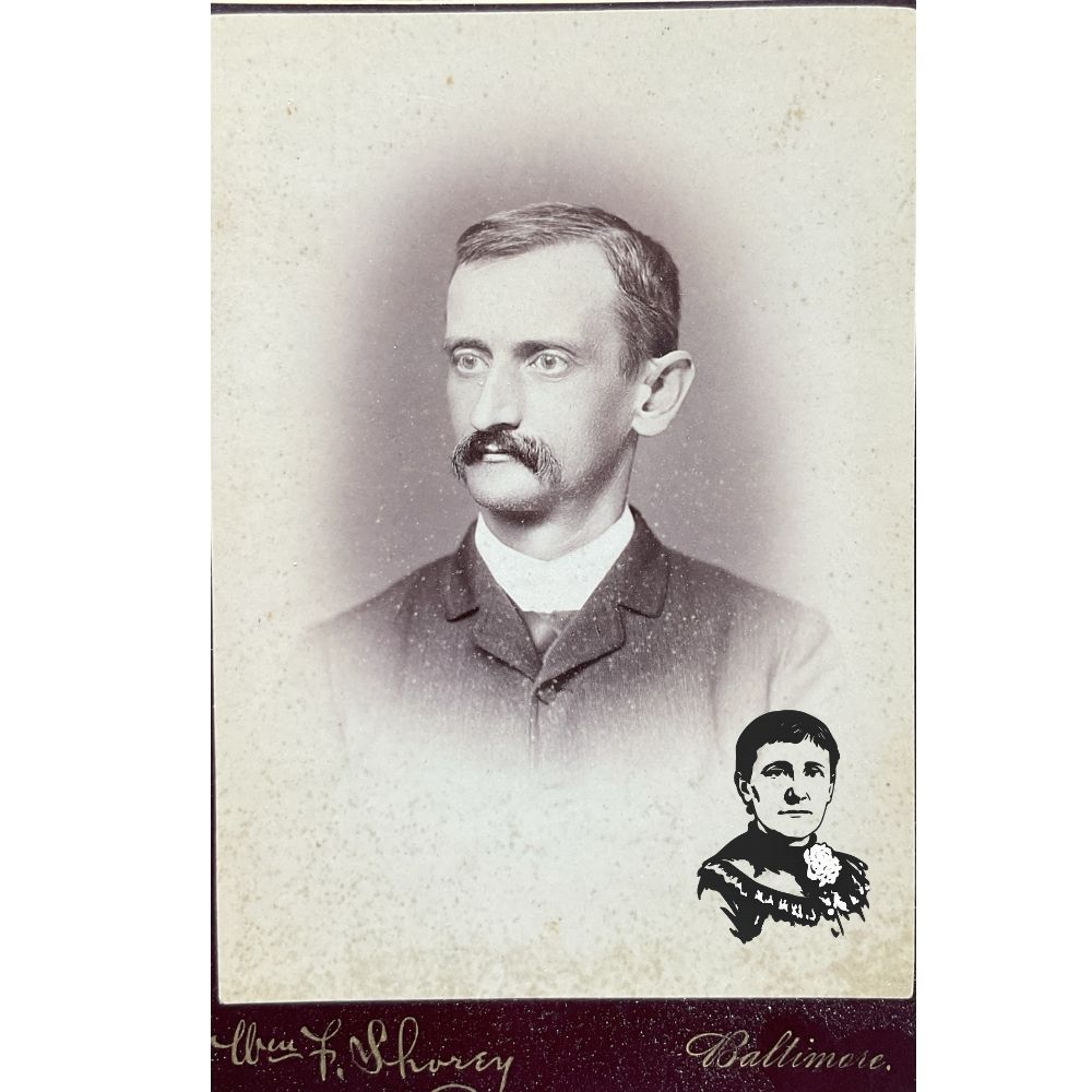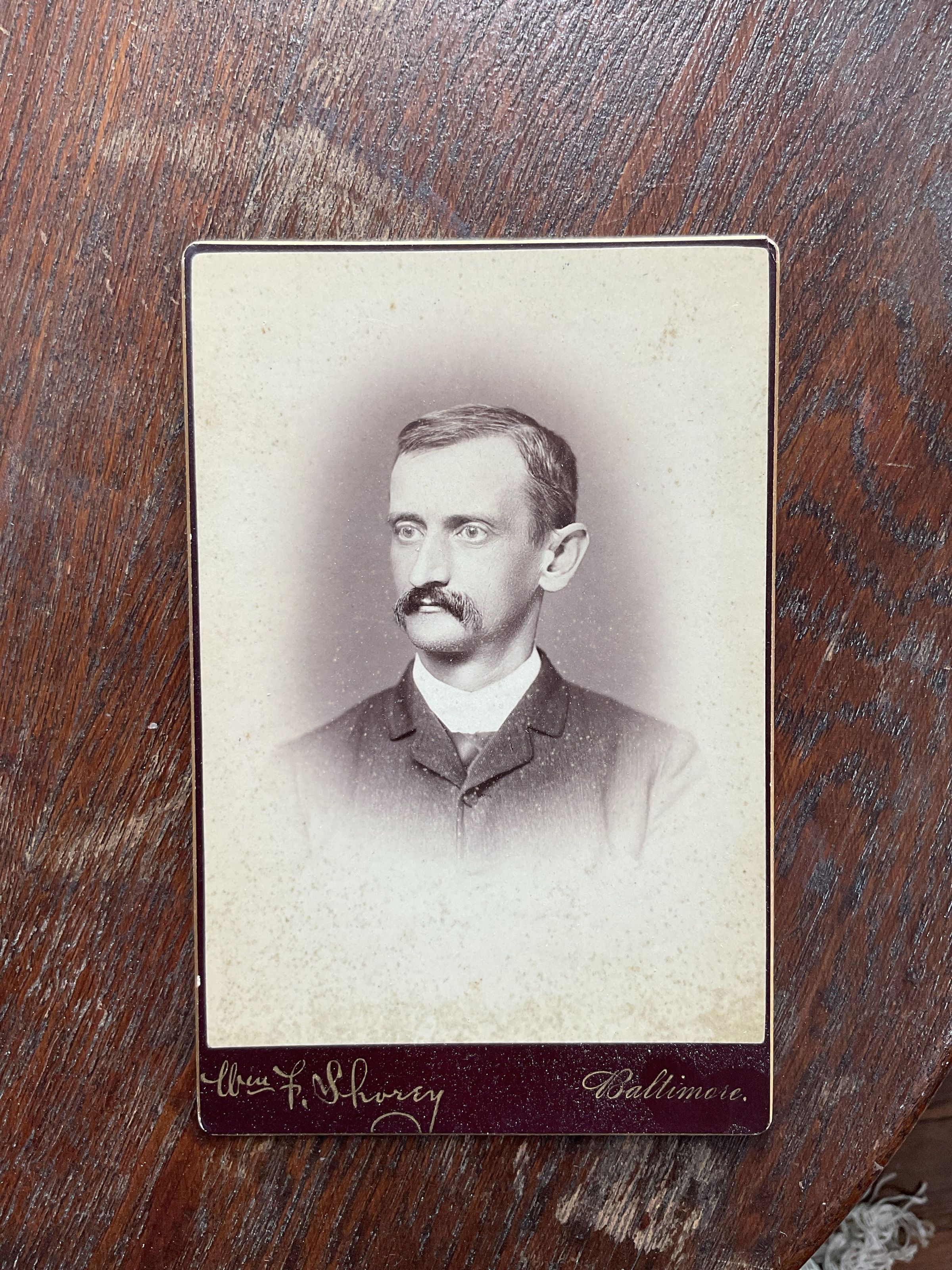 Photograph, cabinet. Image of "I. E. Pierson" [Isaac Everitt Pearson] by photographic studio Shorey Photo Artist, 157 W. Baltimore Street, Baltimore, Md. Undated. Reverse gives negative # 45429. Card has Shorey name on front. Upper torso and head of man with mustache and prominent ears wearing coat, tie and white shirt. 6.5" x 4.25".Acquisition