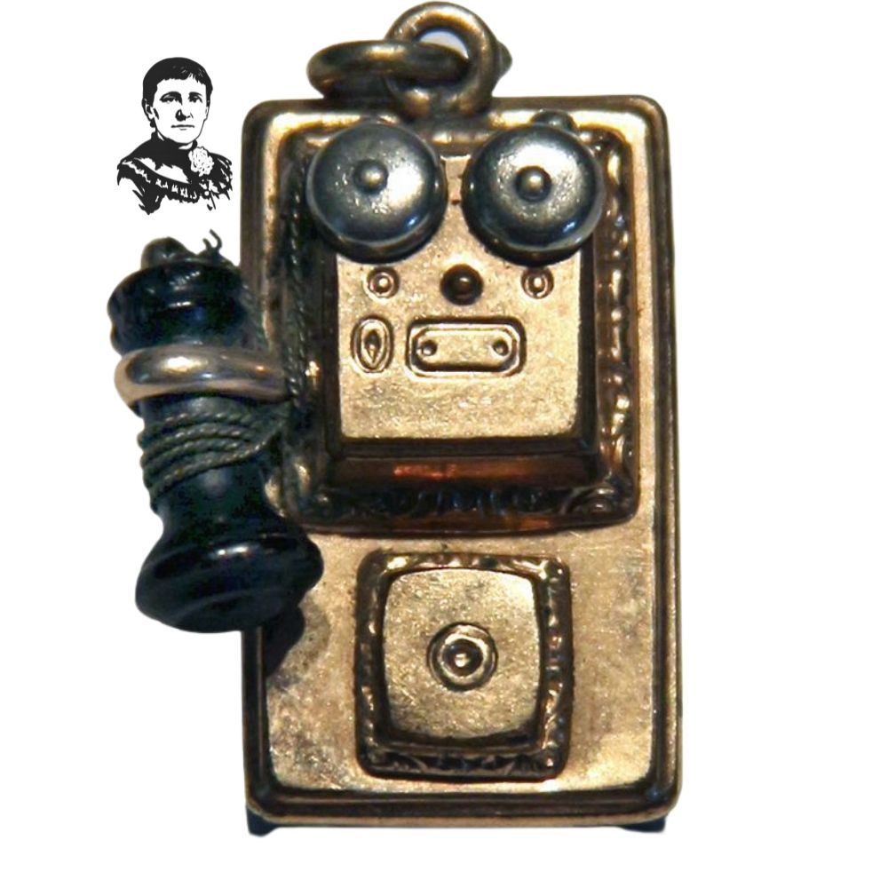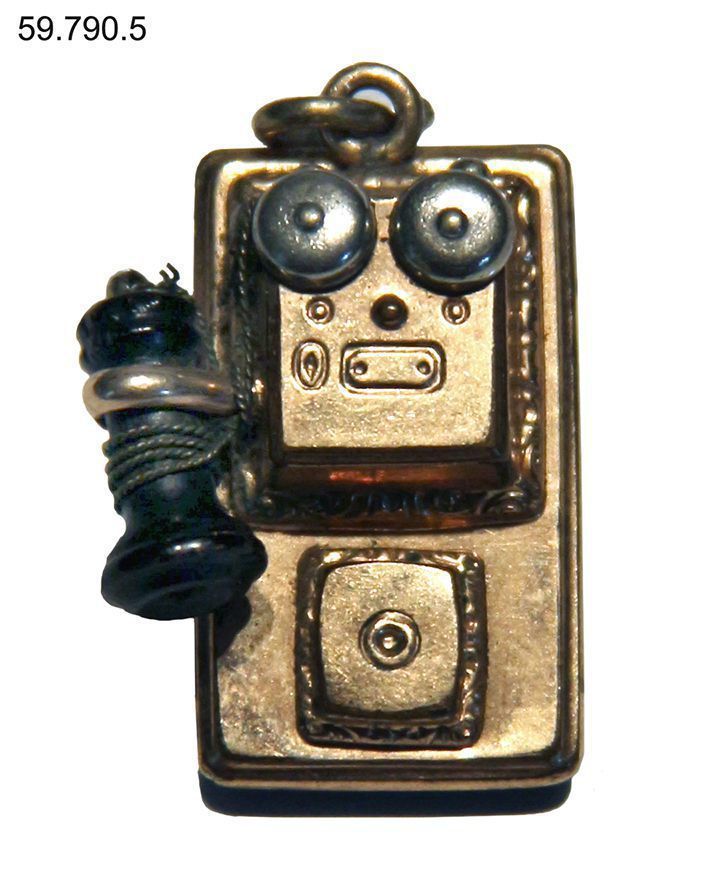 Pendant. Small gold-color pendant in the shape of a wall-telephone; separate earpiece is wired into cradle. Back is a single, flat piece of black glass. 1.125"h x .75"w x .375"d. Small loop at top for attaching to chain, pin or bracelet. Given to Mary Bostwick Shellman by Alexander Graham Bell c. 1885-1890.Context