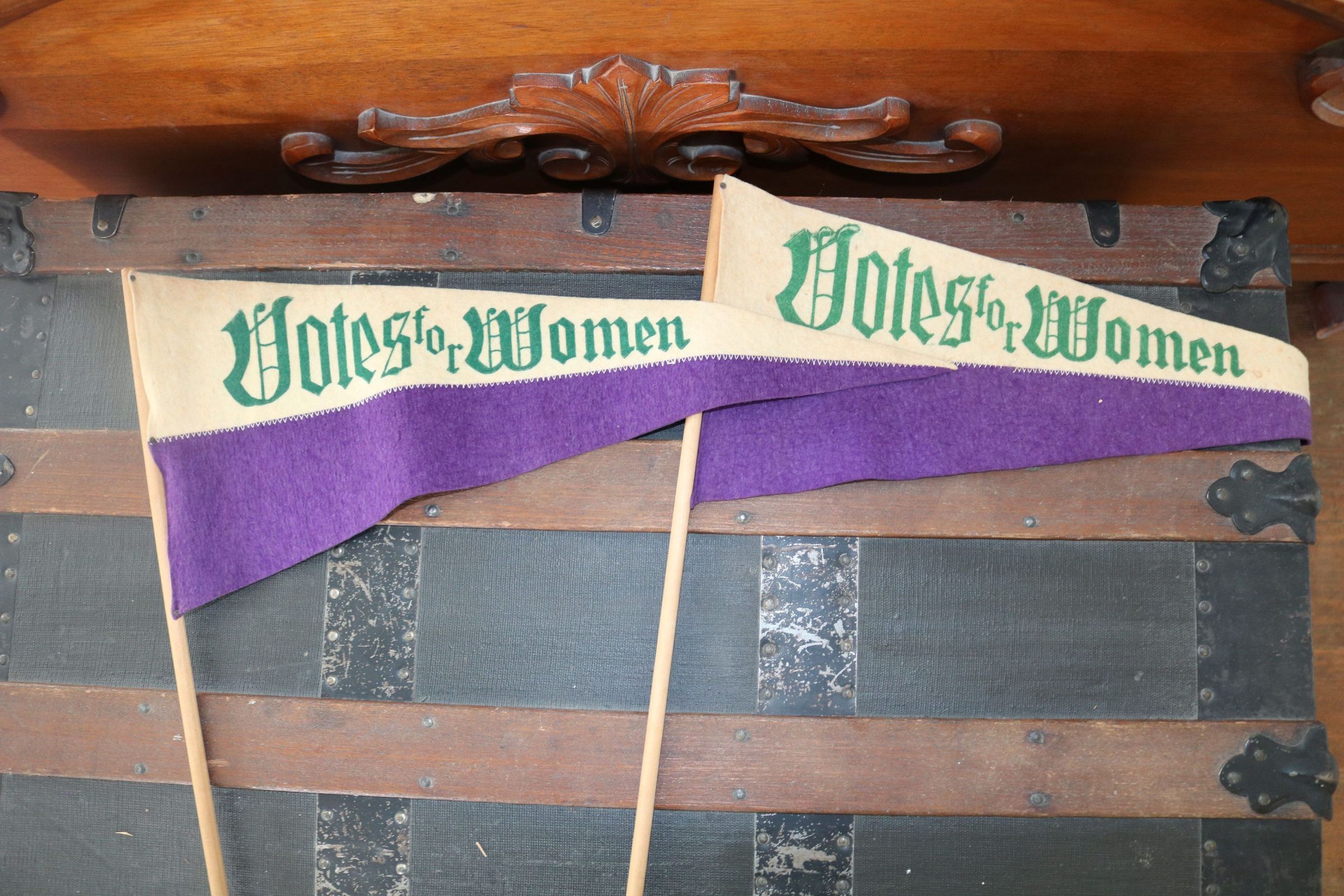 Purple/white felt, green lettering "Votes for Women," c.1910. 18" x 7". With 24" wood dowel.