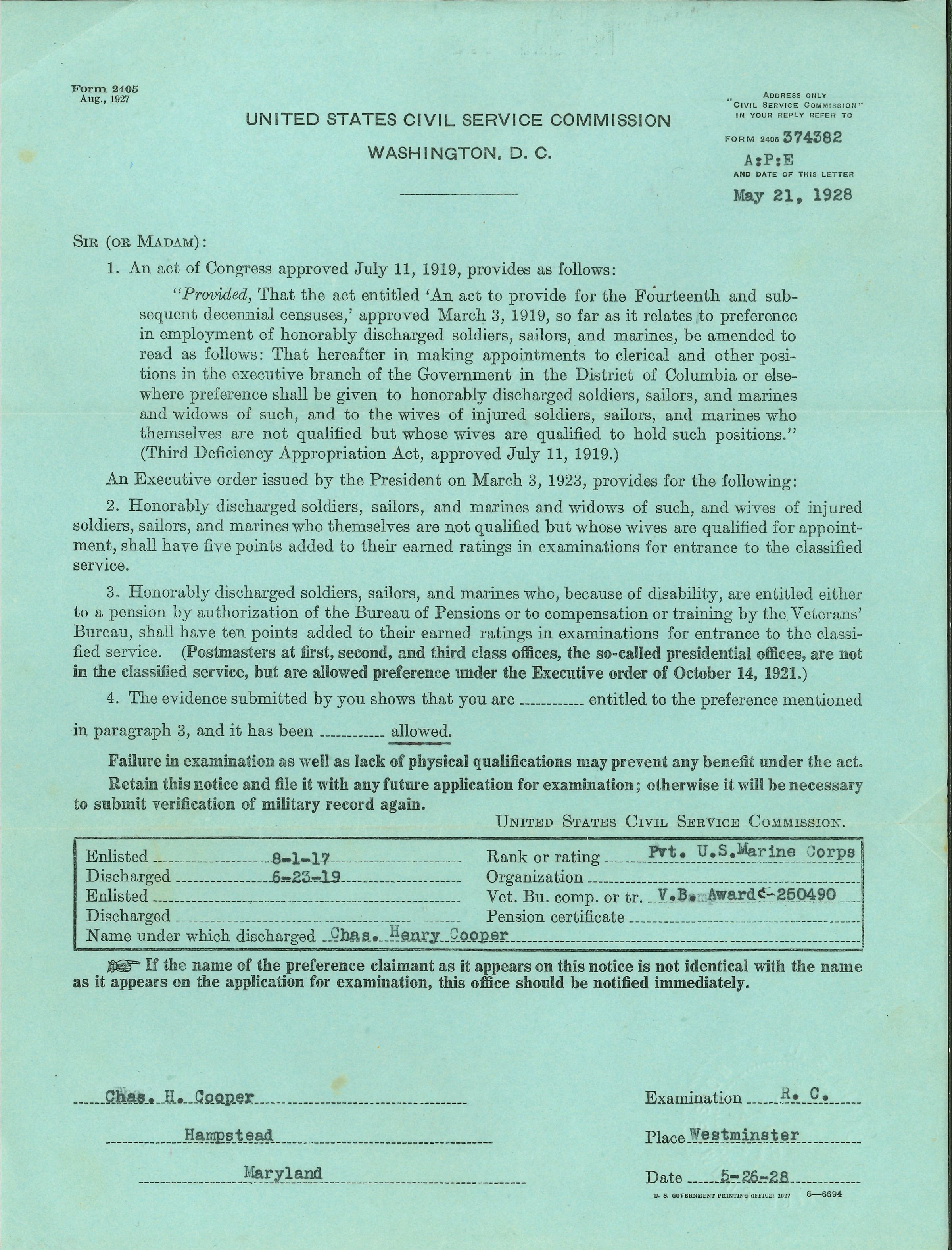 US Civil Service Commission to Charles H. Cooper. Veteran Hiring Preference. 21 May 1928.Acquisition