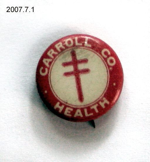 Pin, lapel. Small round disk; red border with white lettering reading CARROLL CO. HEALTH; white medallion at center with red cross that has two arms; straight pin on back. Paper label inside back reads "BANNERS - PENNANTS BUTTONS TORSCH & FRANZ BADGE CO. BALTIMORE MD". Paper over a metal base, with clear plastic covering to protect the paper. .625" diameter. 1930s