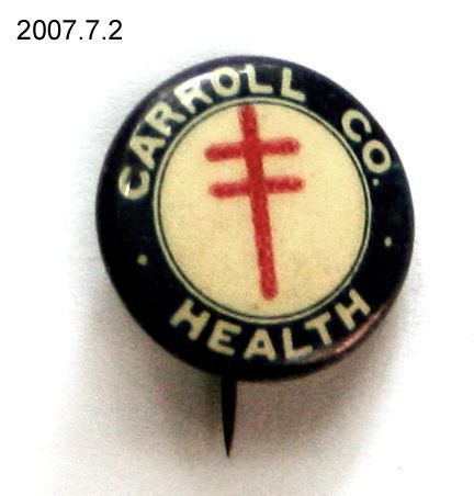 Pin, lapel. Small round disk; dark blue border with white lettering reading CARROLL CO. HEALTH; white medallion at center with red cross that has two arms; straight pin on back. Paper label inside back reads "BANNERS - PENNANTS BUTTONS TORSCH & FRANZ BADGE CO. BALTIMORE MD". Paper over a metal base, with clear plastic covering to protect the paper. .625" diameter. 1930s