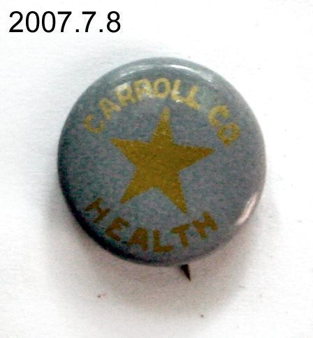 Pin, lapel. Small round disk; gray with gold lettering reading CARROLL CO. HEALTH; gold star at center; straight pin on back.Paper label inside back reads "TORSCH & FRANZ BADGE CO. BALTIMORE MD". Paper over a metal base, with clear plastic covering to protect the paper. .625" diameter. 1930s.