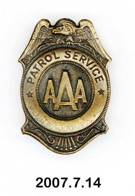 Pin, lapel. Bronze; shield-shaped with clasp pin on back. Embossed design: at top is an eagle with its wings spread; at center is round medallion with AAA at its center; above this is PATROL SERVICE." 1.125" x .75". 1938.Acquisition
