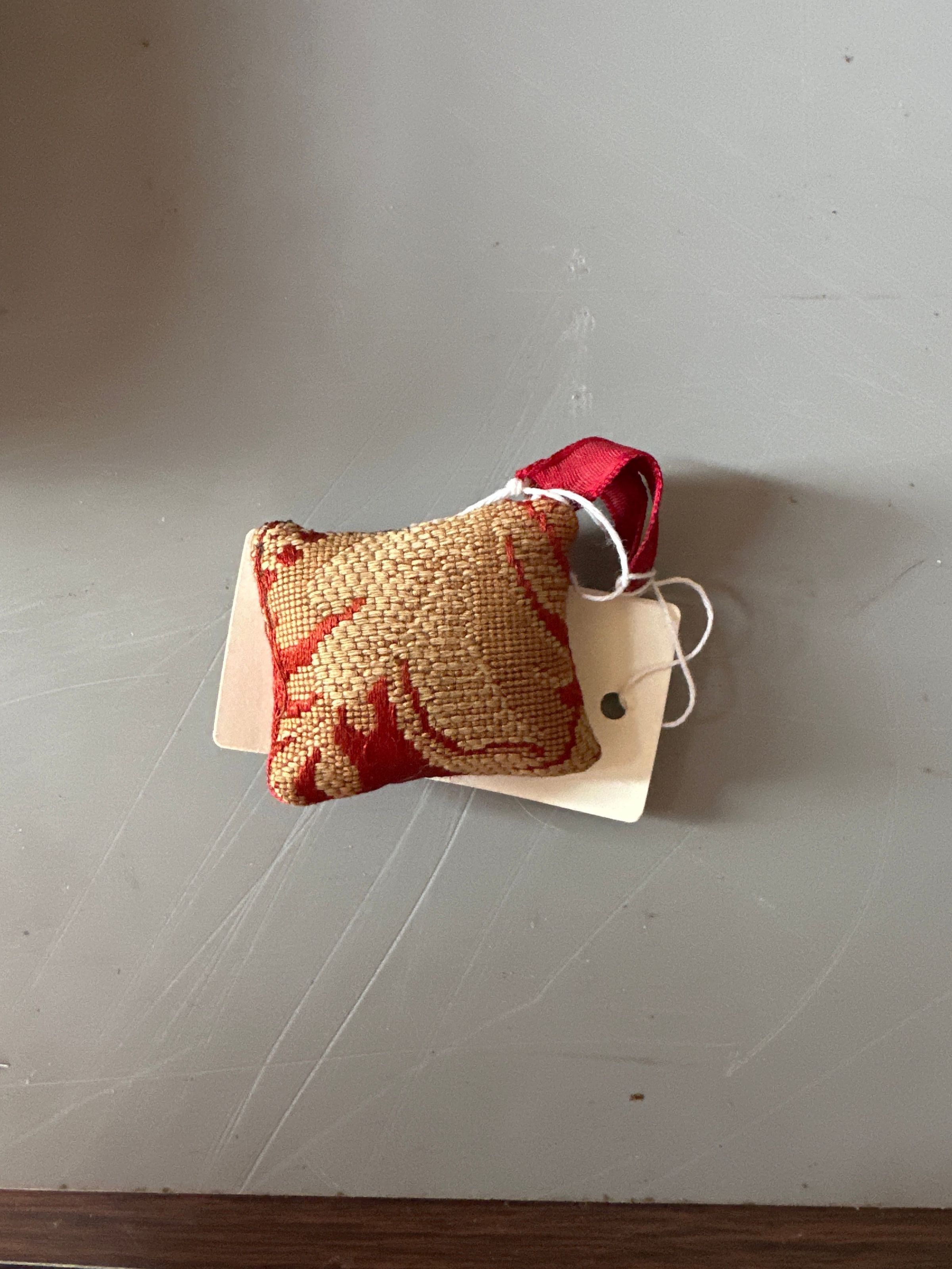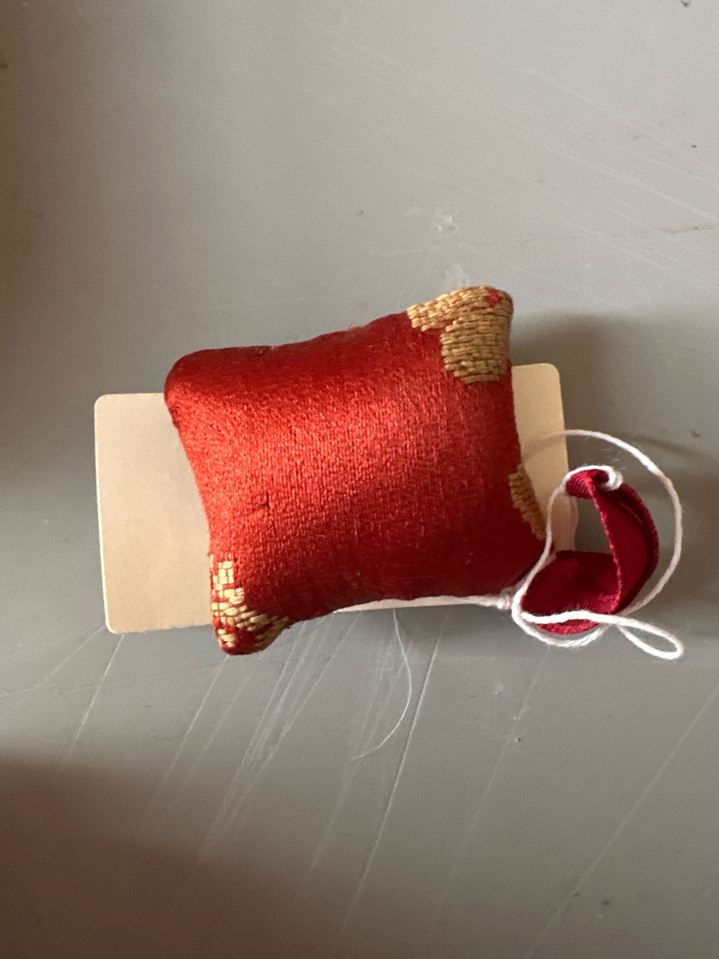 pincushion, red and gold silk brocade with red silk tape loop; fiber filled. 1"h x 2.25"w x 2"d. C. 1850-1875.