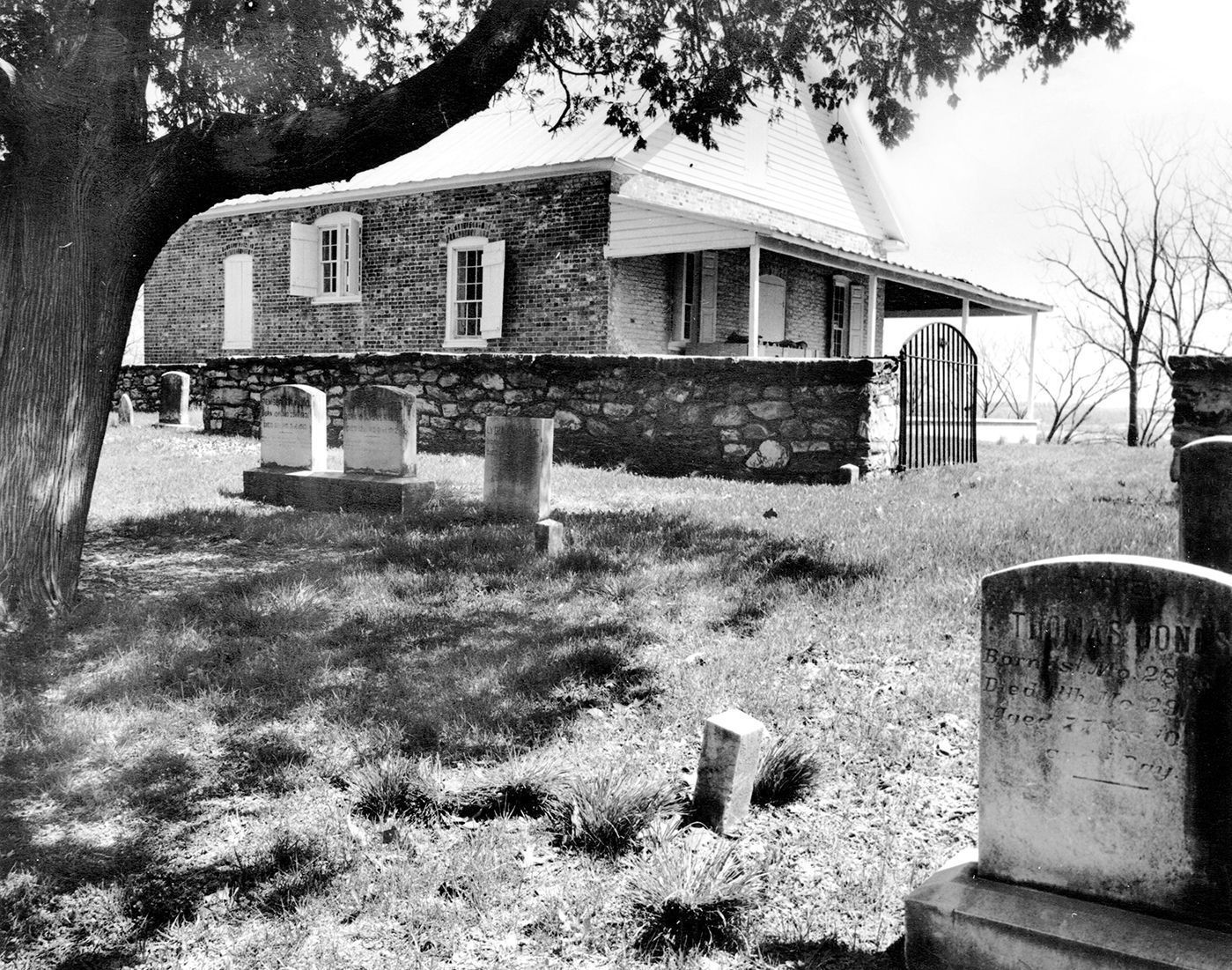 Print, photographic. Pipe Creek Meeting House, Union Bridge. B/W photo of a graveyard with a large tree in it to the left. There is a stone wall with a wrought iron gate between the graveyard and a brick building. The building has three white shuttered windows along the left side. The front has a porch with two white shuttered windows with a door in between. The porch roof is shingled and the roof is white clapboard. Photo: 8"x10"