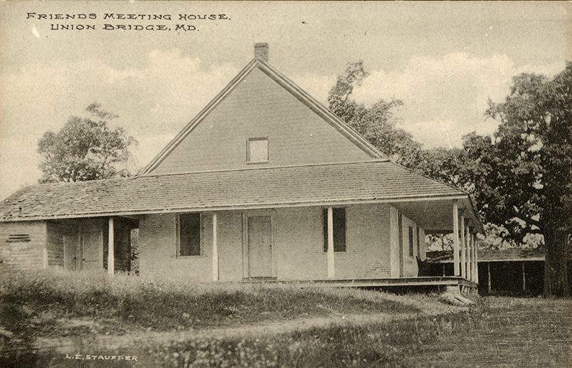 Postcard. Pipe Creek Meeting House, Union Bridge. B/W photo of a white church with a dirt path going by it. The first floor of the church has a porch that extends along the front and right side. The porch has a shingled roof and then the actual roof of the building comes to a point. The porch has a shed-like piece on the left side of the front, a window, a door, and then another window. The right side of the porch has a door, a window, and then another door. Postcard: 3.5"x5.5"