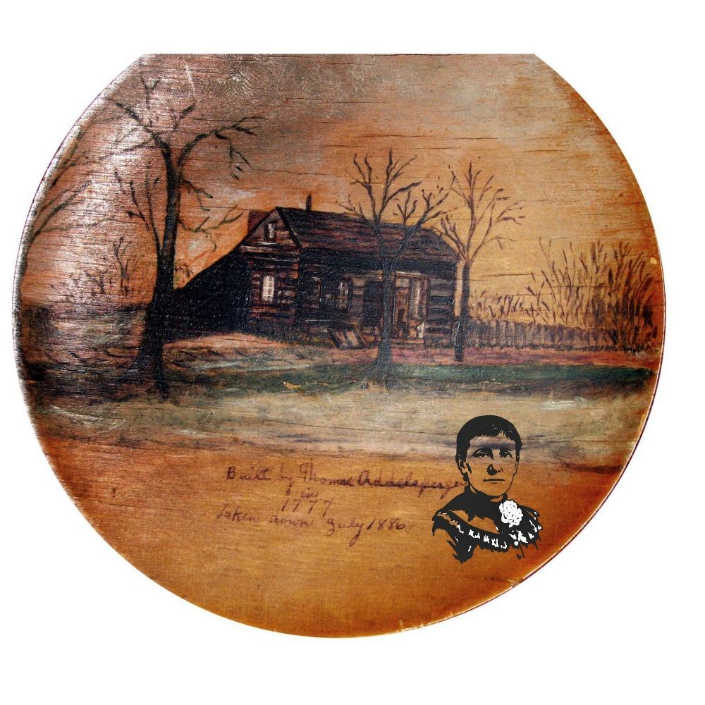 Plate. Wood; round; 7.875” diameter; constructed of two thin pieces of wood laminated together and curved to form a shallow center; decorated with painted image of a log house. Handwritten on front: “Built by Thomas Addelsperger in 1777 Taken down July 1886”. Written on reverse: “Thomas Addelsperger 1777. Painted by Mary Bostwick Shellman Westminster, Md. For Ella Logue Great Granddaughter Thomas Addelsperger.”Acquisition