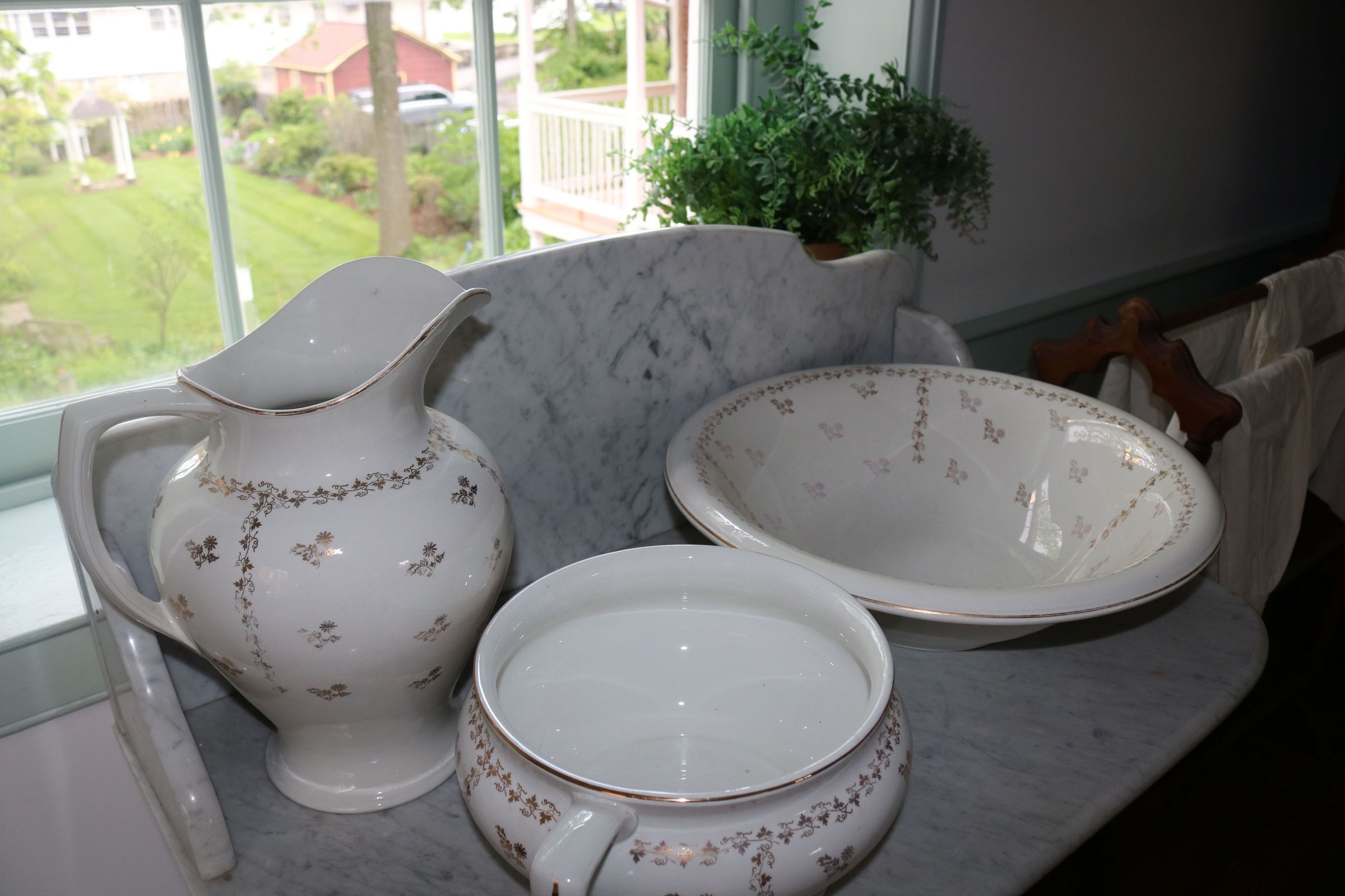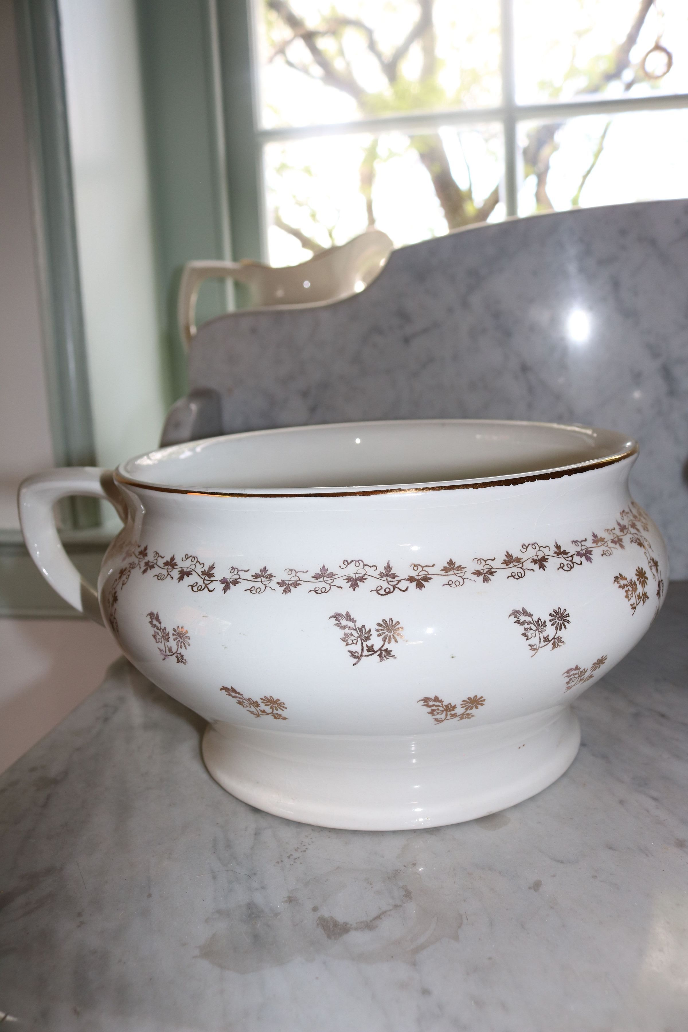 Pot, chamber. Round, oversize mug, flared rim and foot, one handle attached under rim and to lower body. White glaze with gold leaf daisy and vine motif, gold band around rim and down handle. Green stamp on bottom "HOMER LAUGHLIN 60N." 8"h x 11"w x 9"d. (Matching toilet set, 89.19.33 - 89.19.38) WMC inventory F68 and F64B.