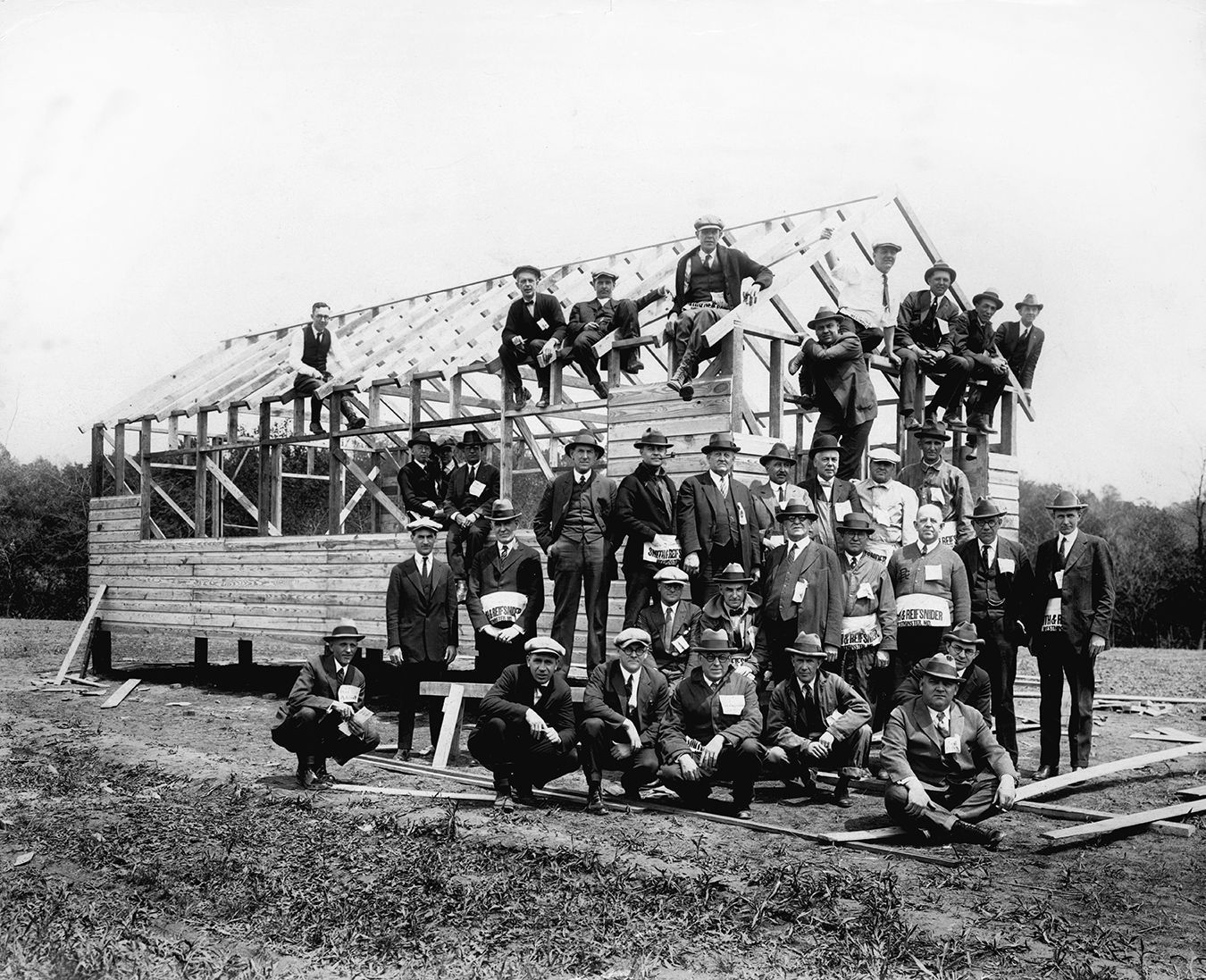 Print, photographic. B/W silver gelatin print, 8" x 10". Shows the Westminster Rotary club members building a meeting house for the Boy Scouts, Bridgeport, MD, 6 May 1925. The wood framing for the building is in place and the Rotary members are posed around and on the framing. Written on back is "Rotarians build house for Boy Scouts Bridgeport May 6, 1925Acquisition