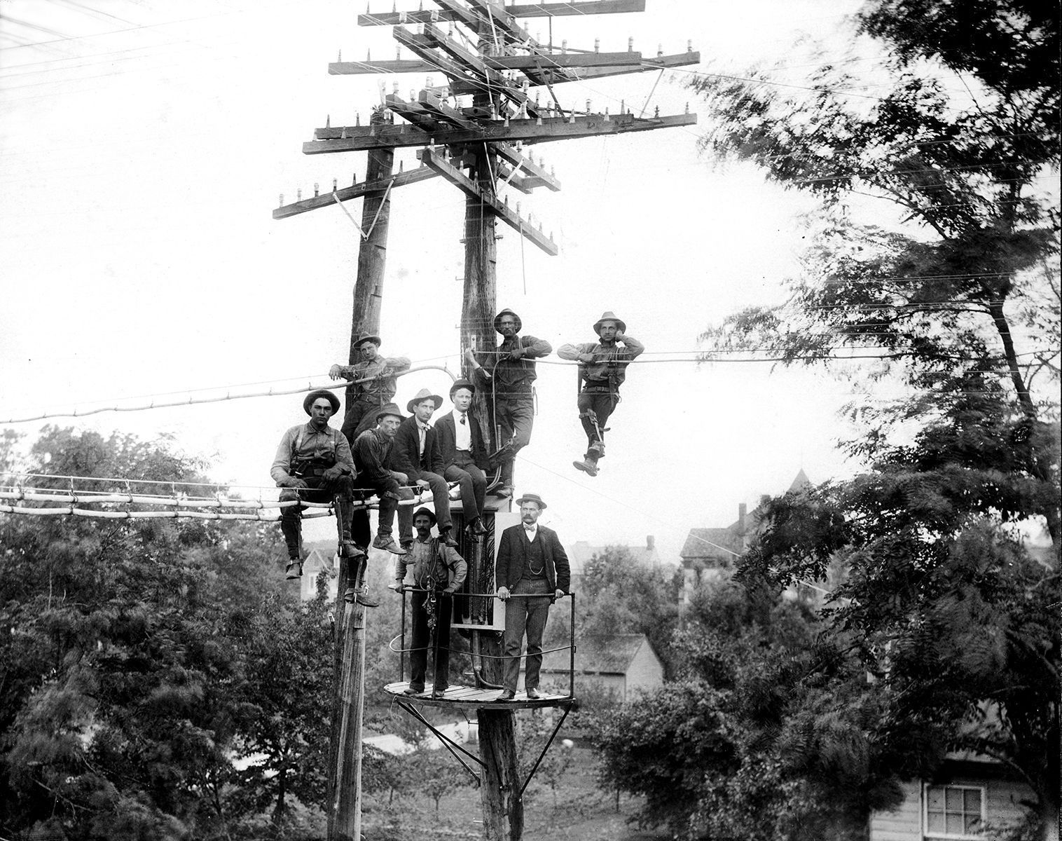 Print, photographic. Men on a telephone pole, off E. Main Street, Westminster. Listed as the first telephone exchange. Names listed on the back. Black and white image mounted on black mat board. Overall size are 11" x 14"; image size 7.5" x 9.5". Maker's mark is impressed on the lower proper right corner on the mat board reading "Mitchell's Art Gallery, Westminster,MD". The back reads "Platform - L & R - Corky ["Yingling'"], Frank Myers. Seated L& R - Charlie [ Last name ] ? Charlie Brown, Guy [Fringer] Jr. Standing - L&R ? Charlie [ Last name] ? Taken in alley off E. Main Street. Mrs. May Snyder - donor (telephone)"Acquisition