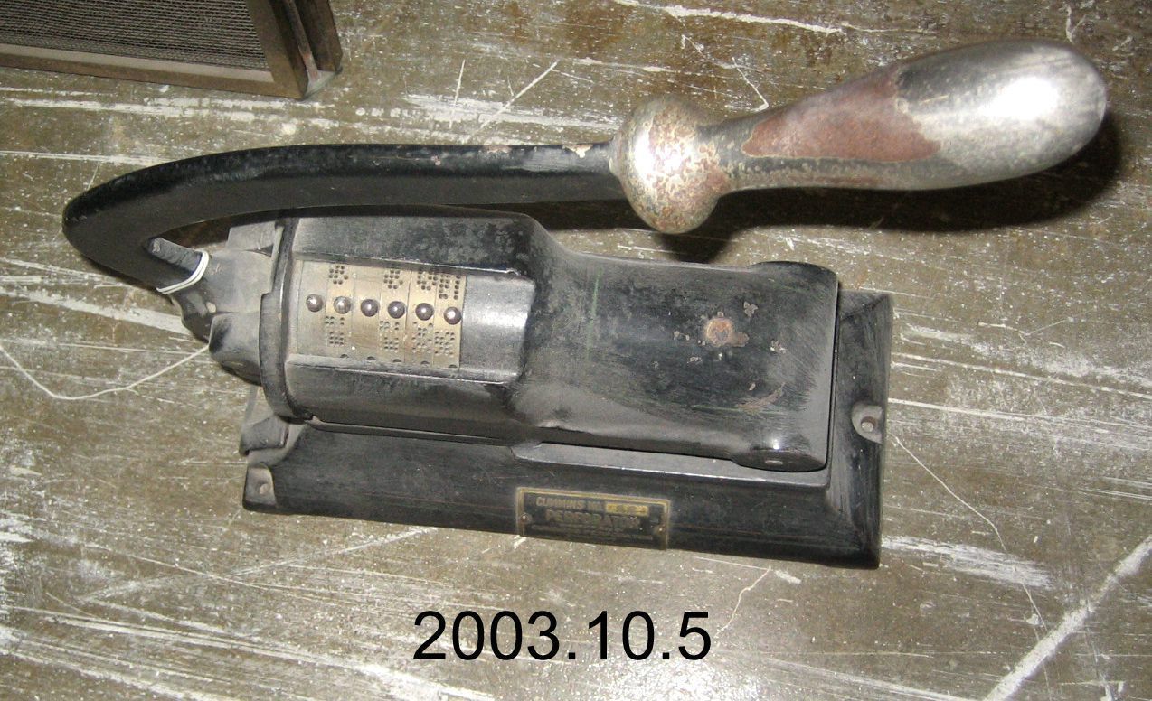 Protector, check. "Cummins No. 18 Perforator" made by the Cummins Perforator Company, Chicago. Heavy steel, painted blue.Acquisition