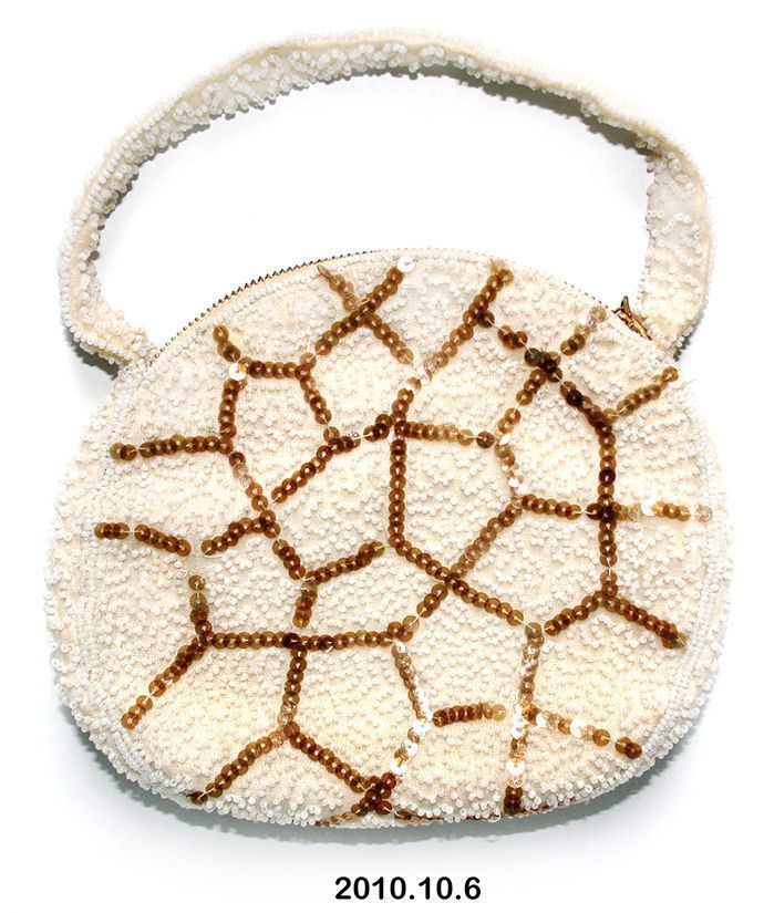 Purse. White fabric body with spiderweb of gold sequins, remainder covered with small white beads; strap handle is covered with beads on both sides, zipper closure. 5”h x 6”w, not including handle.Acquisition