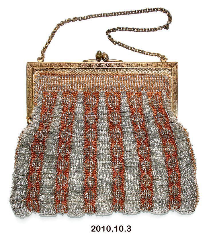 Purse. Rust-colored fabric with 7 columns of clear beads alternating with 6 columns of diamond-shaped clusters of clear beads, gray silk lining; brass frame at top with chain handle. 7.5”h x 7”w, not including handle.Acquisition