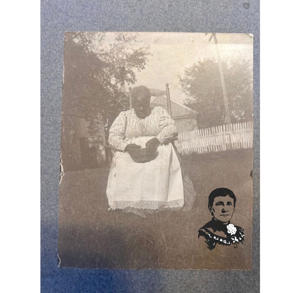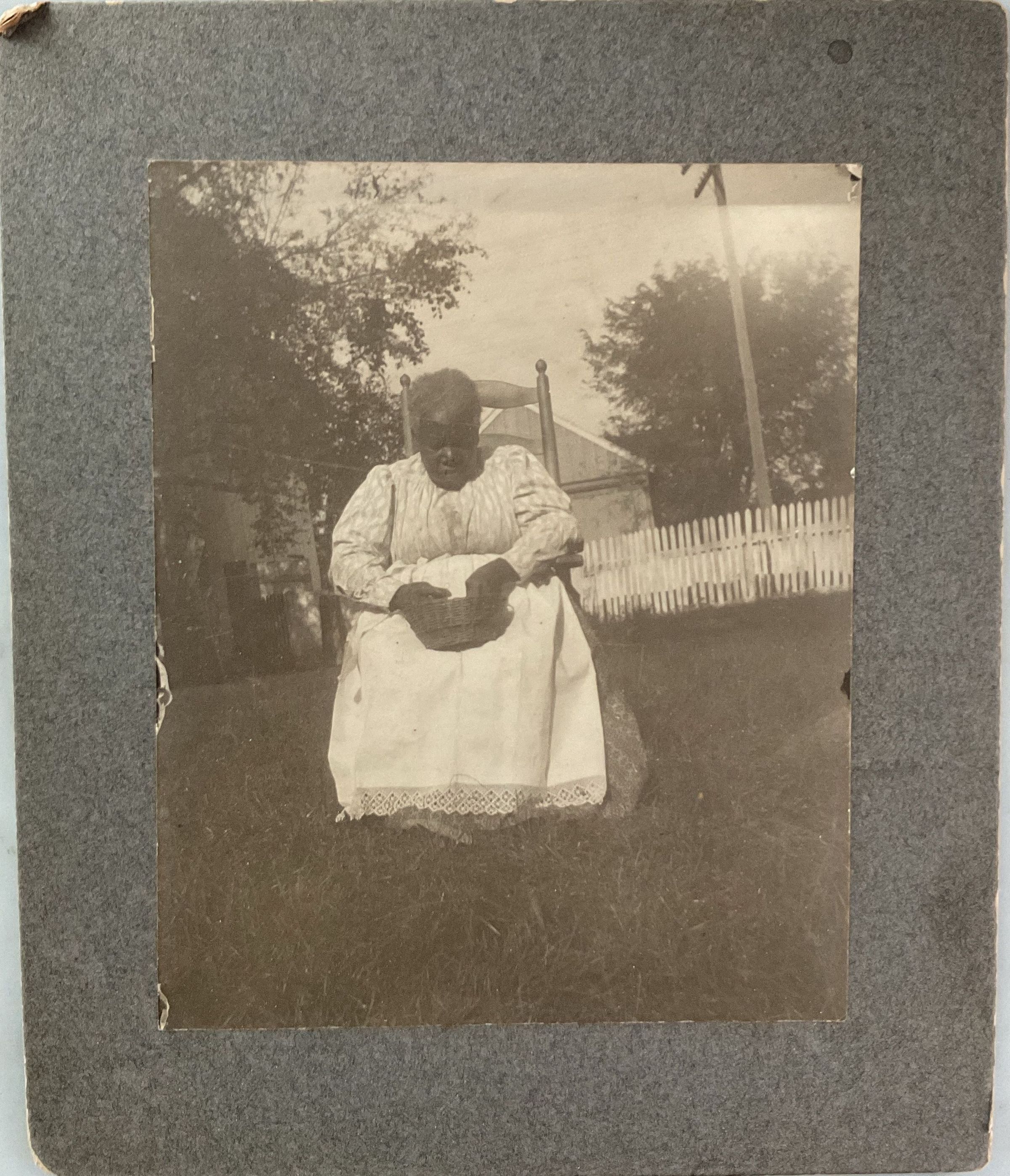 Print, photographic. Image of Aunt Rachel Pye by unknown photographer - possibly amateur snapshot. Undated. Mounted on cardboard. Handwritten on reverse side "Aunt Rachel Pye, No. 9." Also handwritten by Paul Reese "Life long devoted friend of M. B. S. and faithful servant of the Maulsby family and Mrs. Maulsby’s sister, Mrs. Grant (or Grout), P.R." Full-length picture of older, rotund African-American woman seated outside in a ladder-back chair. She wears a long dress with a starched apron and holds a basket on her lap. Location unidentified. Overall size 6.5" x 5.5"; image size 4.75" x 3.75".Context