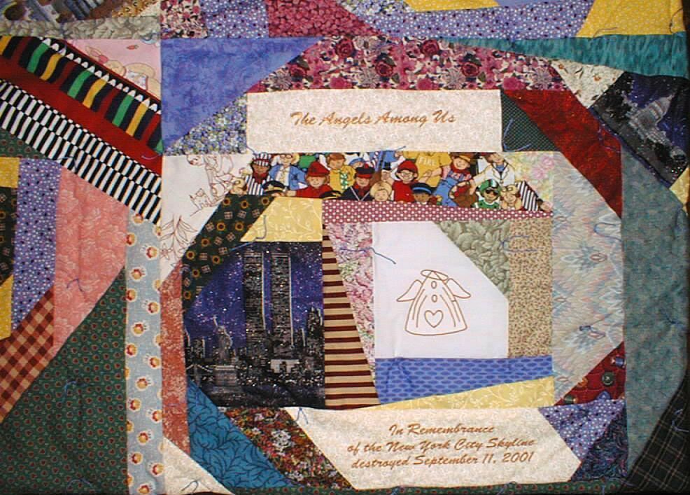 Quilt. Pieced quilt constructed of four rows of three large blocks each. Each block is pieced to form triangles at each corner; white piece at center of each block has an angel embroidered in gold. Fabric is cotton in an assortment of prints including hearts, flowers, snowmen and cowboy boots and stripes and plaids in a variety of colors. Two pieces are printed with an image of New York City showing the World Trade Center towers and the Statue of Liberty. One piece embroidered "The Angels Among Us"; another embroidered "In Remembrance of the New York City Skyline destroyed September 11, 2001". Backing is single piece of white cotton. Top tufted to back with blue yarn; no edging. Label stitched to back reads "High school students, senior citizens, and other volunteers came together to create this 'Angels Among Us' quilt in honor of The Shepherd's Staff for their tenth anniversary, celebration November twelfth two thousand one." 85"h x 70"w.Context