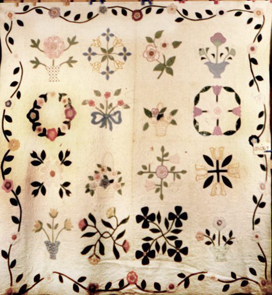 Quilt. Pieced and appliquéd quilt. 80" x 80". Constructed of 16 blocks, approximately 16" each. Blocks arranged in 4 rows of 4 squares; squares machine stitched together. Flowers in solid and print pastel colors (green, blue, pink, lavender and yellow) hand appliquéd to each block. Handstitched decorative patterns include wreaths, stars, pinwheels and leaves. Border is 7.5" white cotton with floral and vine appliqué. White bias binding machine stitched to front and hand stitched to back. White cotton backing. C.1920.Context
