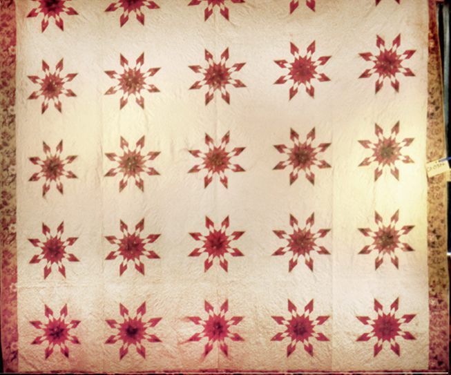Quilt. Pieced quilt, 110" x 110.5". Constructed of 25 pieced blocks and 16 white blocks, each 13". Pieced blocks made of red print, brown print and white alternate with white blocks. Hand quilted in wreath pattern. Names of the sisters who made the quilt are quilted in the corners. Signatures read "MAY 1834 AMANDA MATTER AMANDA MATTER JULIA ANN MATTER SARAH MATTER J.N. PARKE". Border is 1" cotton chintz with floral pattern in beige, red and blue. Edged by rolling back over front and handstitching. White cotton backing and cotton filler.Acquisition