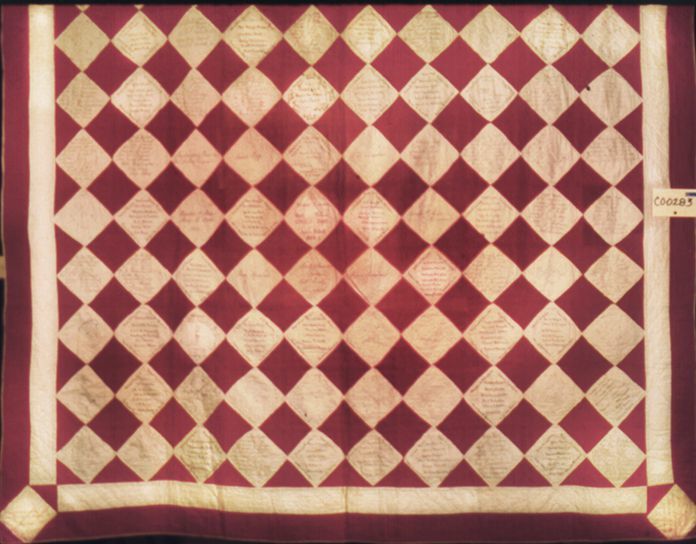 Quilt. Pieced album quilt. 76.5" x 76.5". Red and white diamond pattern composed of 100 white blocks with signatures and 81 undecorated red blocks. Blocks measure 4.5". Center block has picture of the Stone Chapel and inscription "STONE CHAPEL BUILT 1783 REBUILT 1800 Again Rebuilt 1884-5. Red and white striped border. Backing of white cotton. 1900.Context