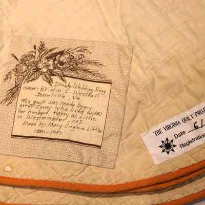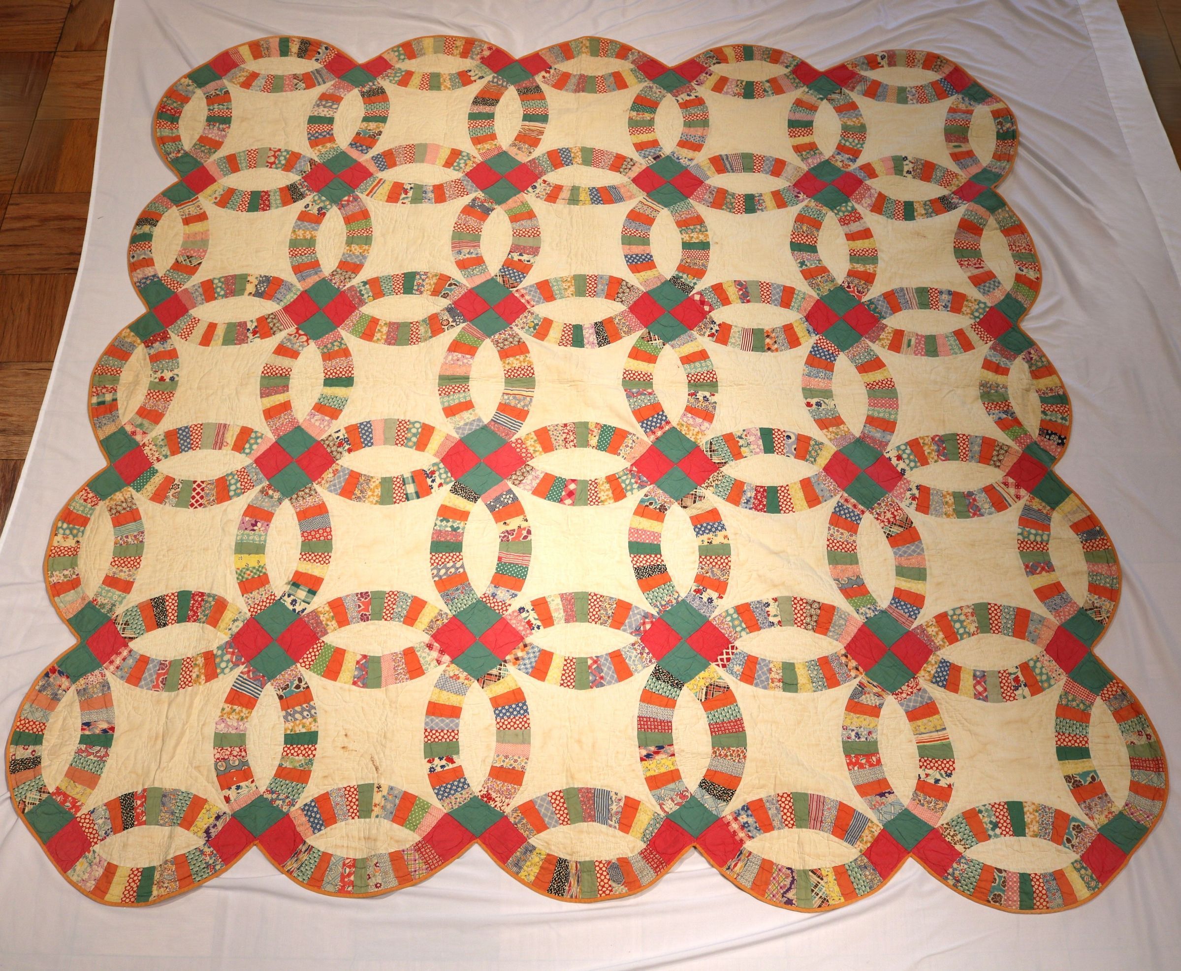 Quilt, Double Wedding Ring pattern. Red, green and multicolored strips of various patterns of fabric make up the ring pattern on beige background with orange trim along edges. Good condition, some minor staining. Previously documented by The Virginia Quilt Project on June 10th 1987, registration number LE26. Additional label sewn onto back of quilt with floral bouquet on geometric background reads "Double Wedding Ring owner: Kristin L. Westfall Purcellville, VA. This quilt was made by my great Jenny who lived with her husband Harry W. Little in Westminster, MD. Made by: Mary Virginia "Jenny" Little 1880-1957". c. 1940s. 80" x 80".Context